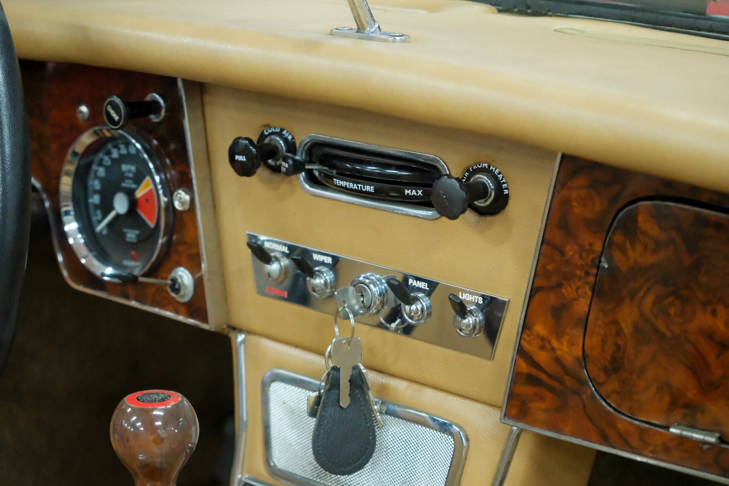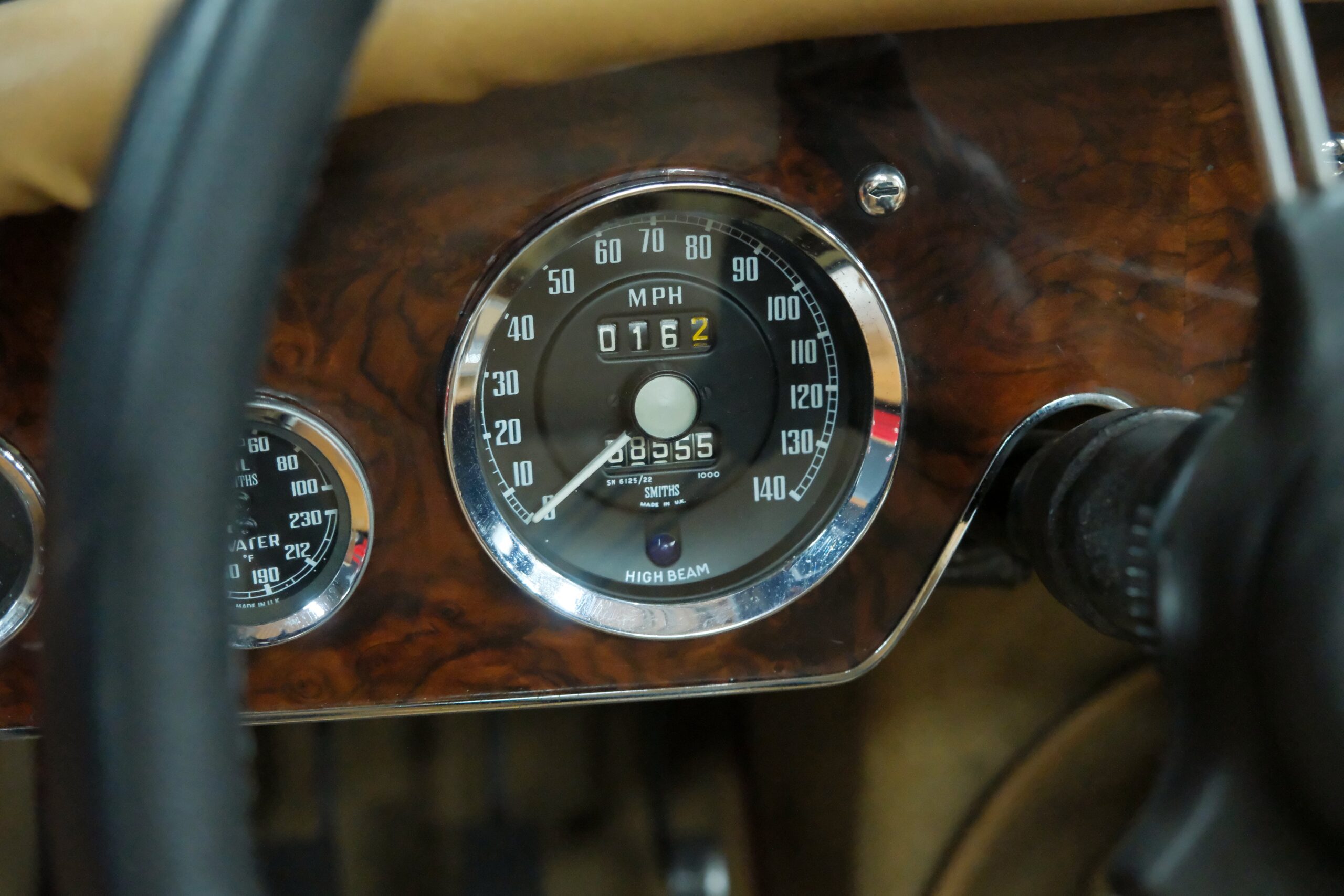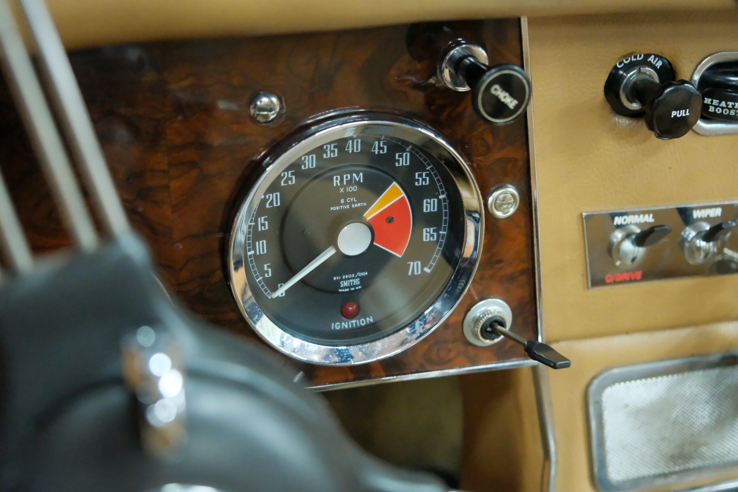 Présentée dans sa très belle combinaison rouge avec sellerie beige et tableau de bord en ronce de noyer vernis, notre auto a bénéficié d’une importante révision au sein de notre atelier.