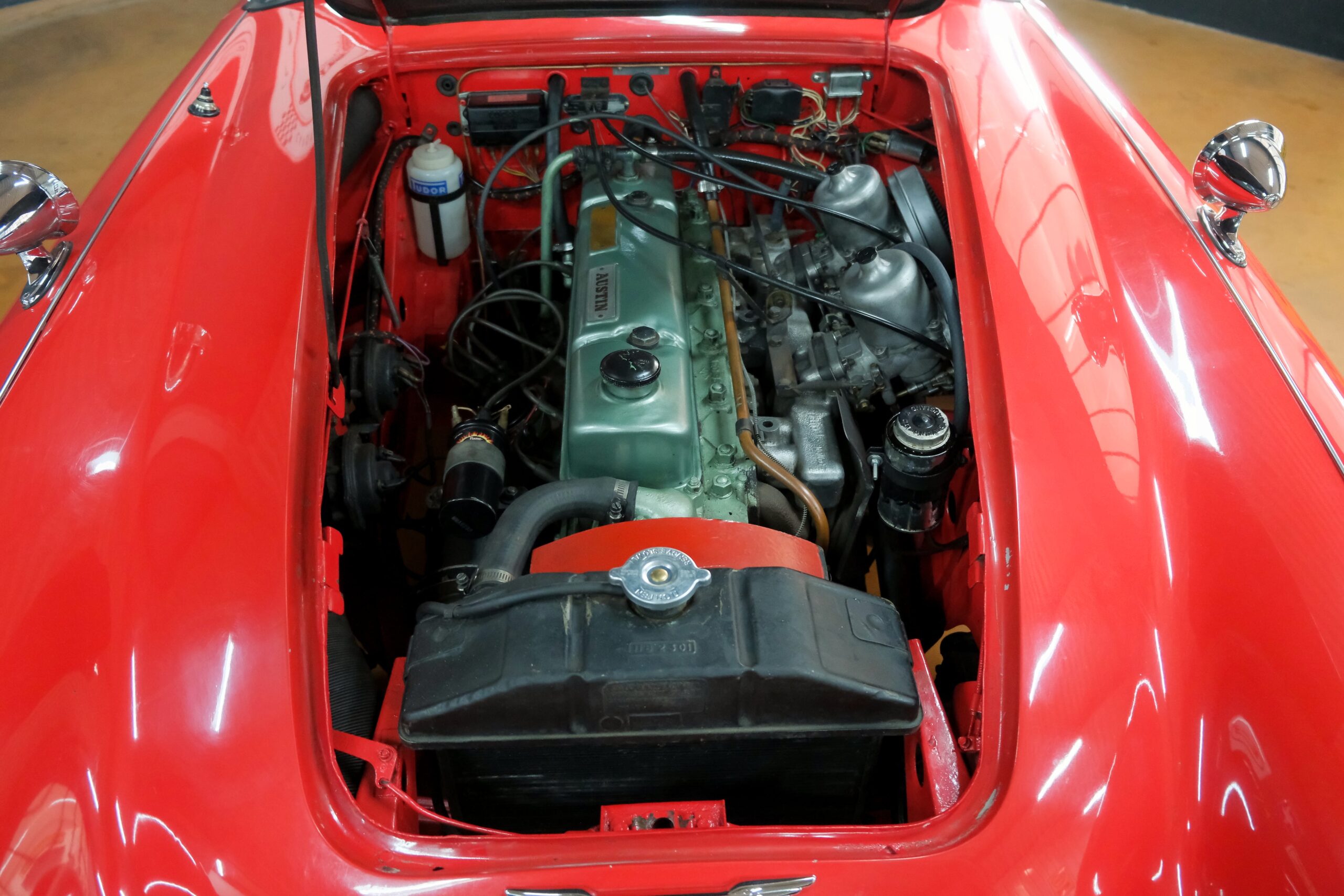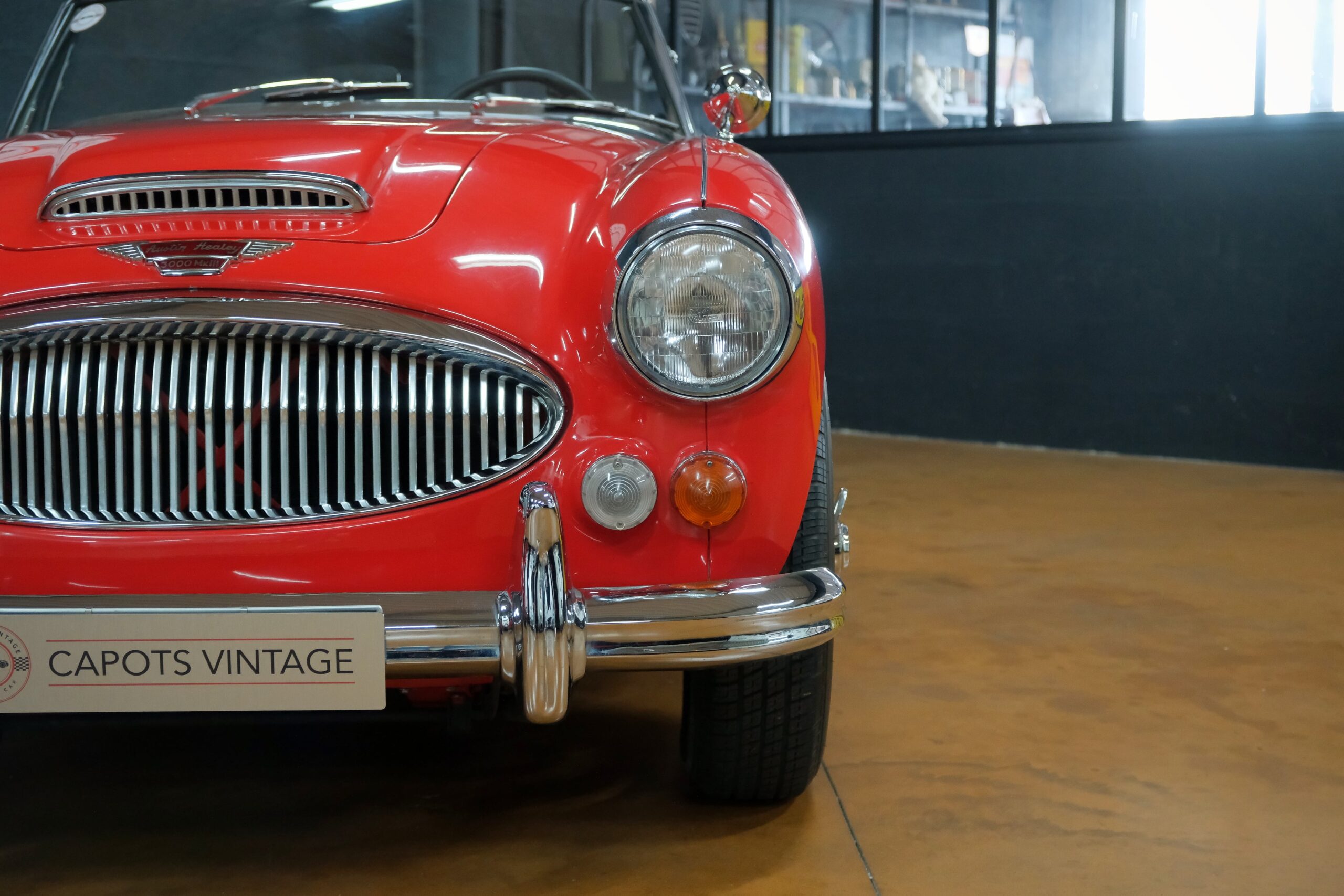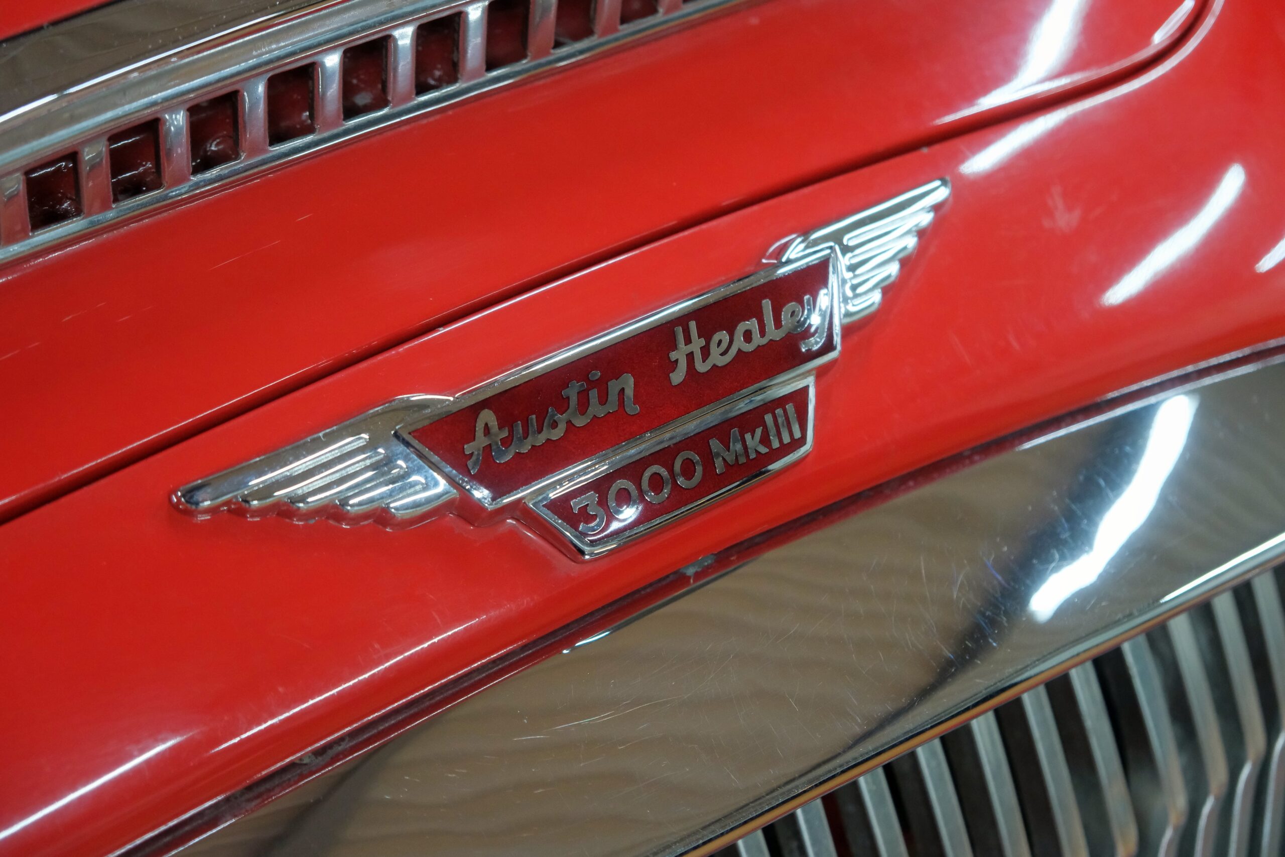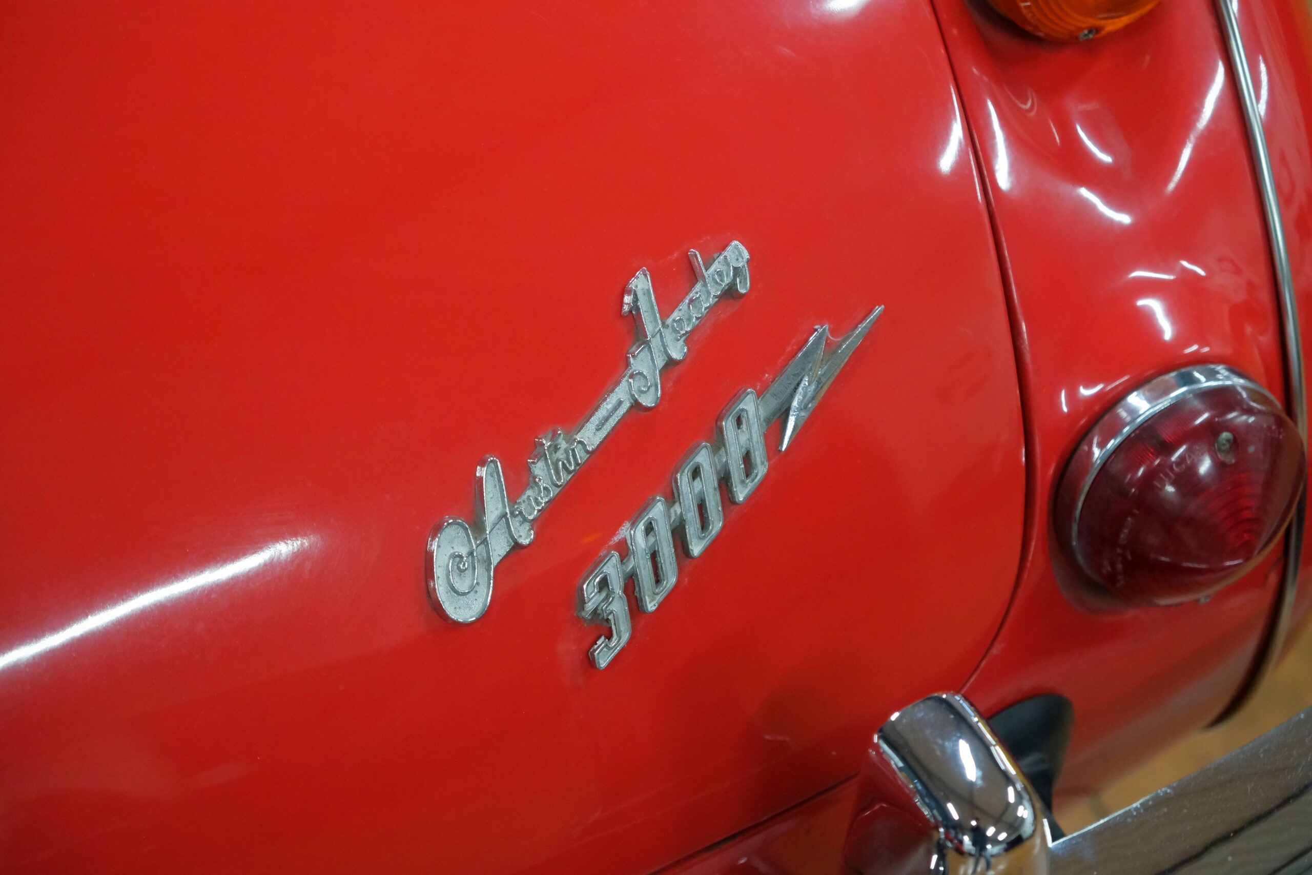Considérée comme la plus confortable et la plus luxueuse des Austin Healey, c’est une toute dernière version des modèles 3000 que nous vous présentons : une 3000 MK3 BJ8 de deuxième phase. Version BJ8, c’est ainsi une 4 places et est équipée du moteur 6 cylindres en ligne de 148 chevaux. La phase 2 présente certaines différences esthétiques de la phase 1 : les indicateurs de direction sont séparés des feux de position et les disques de frein ont un diamètre plus grand.