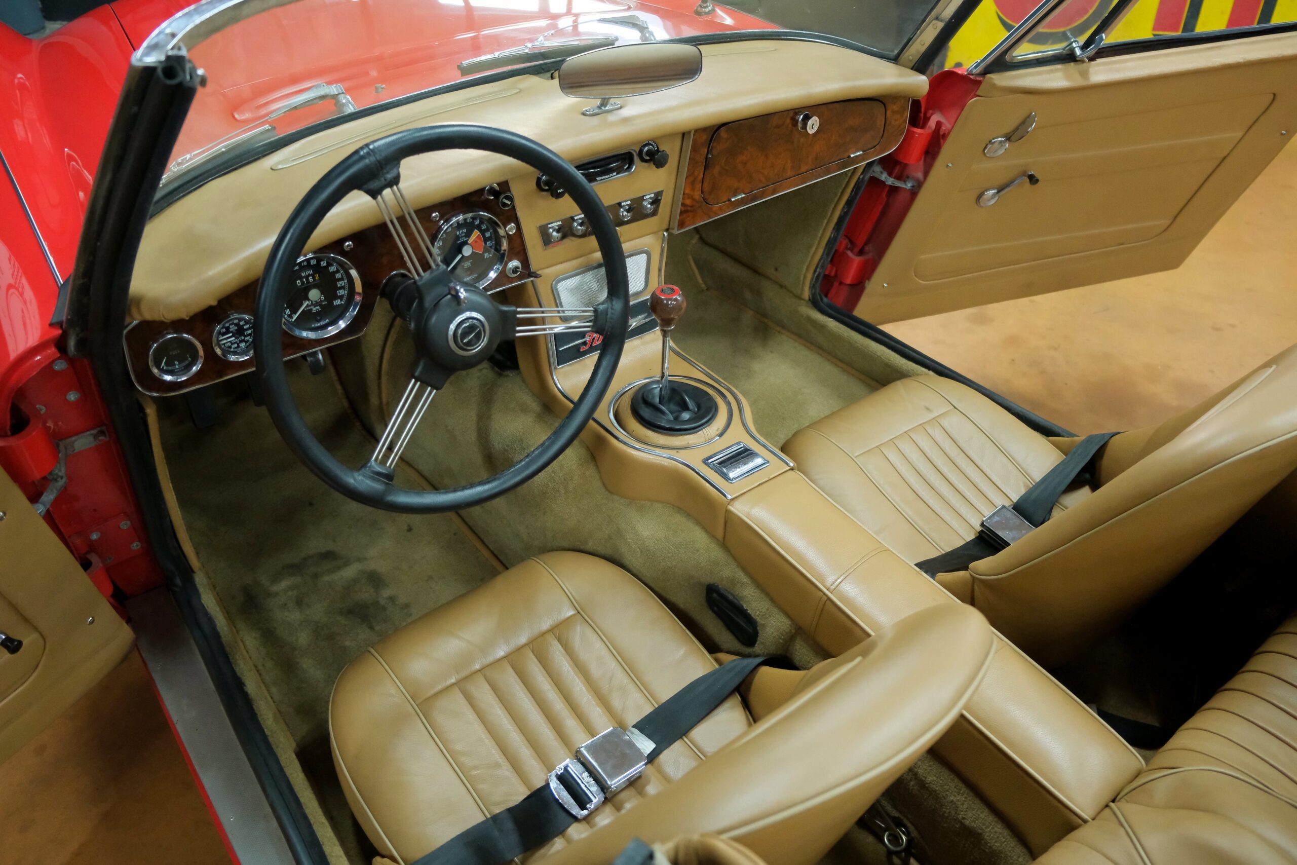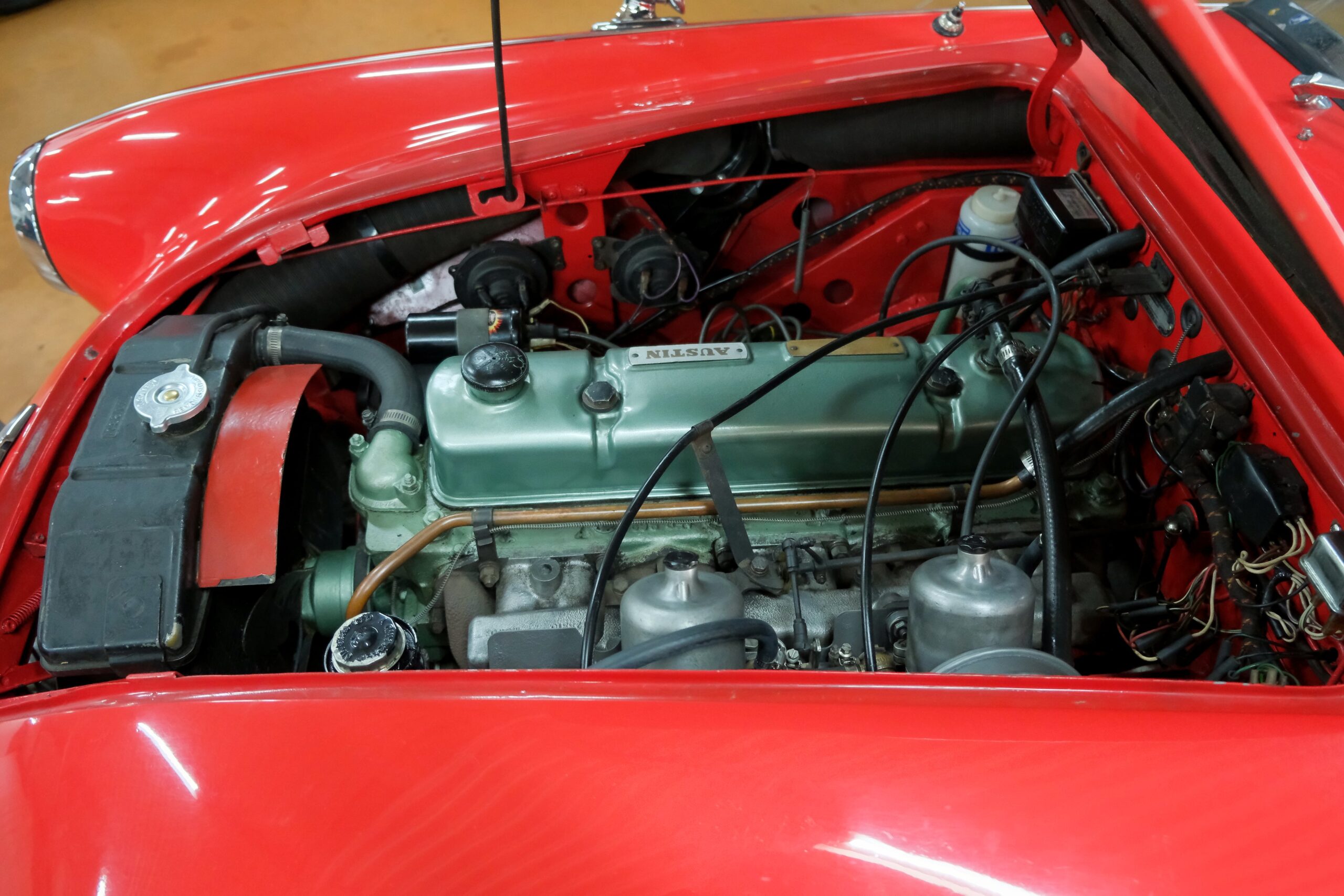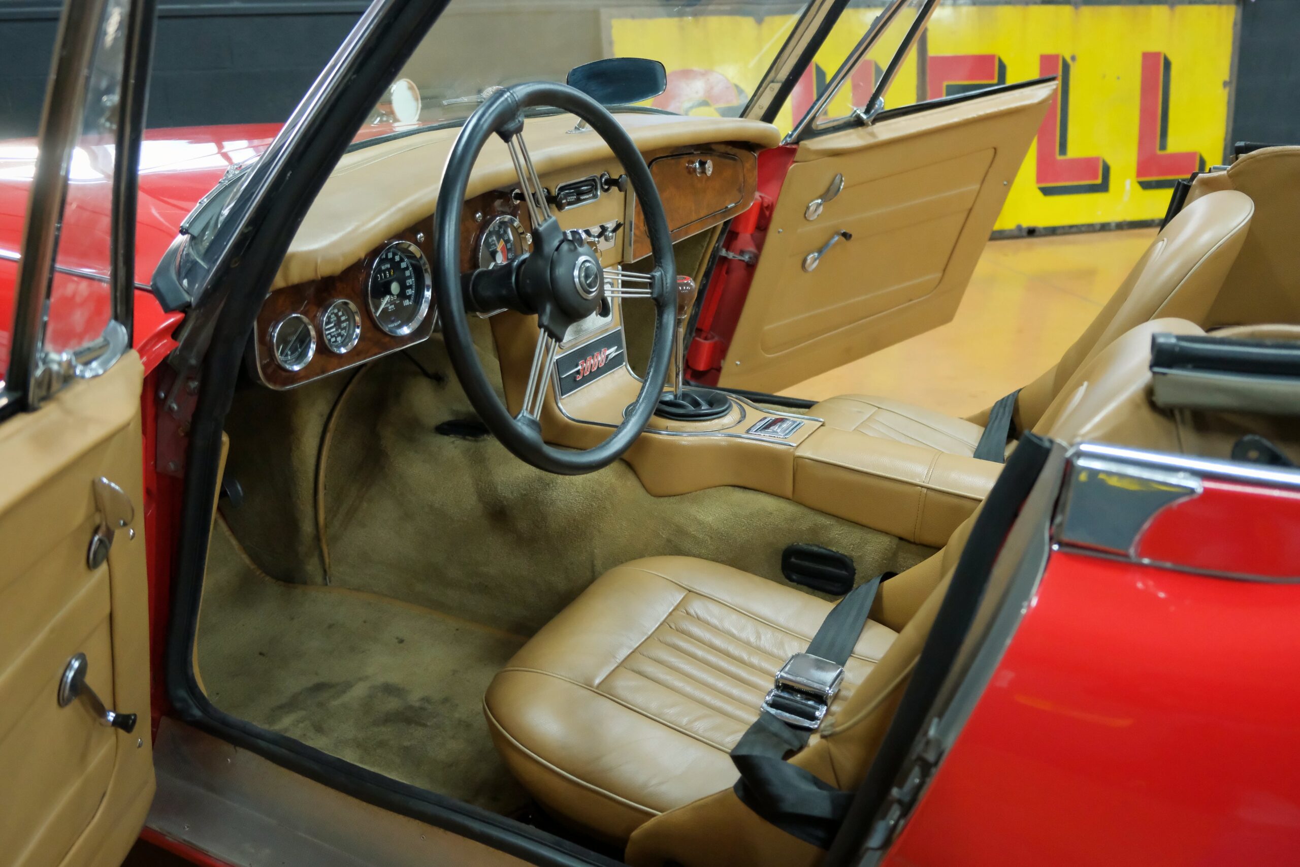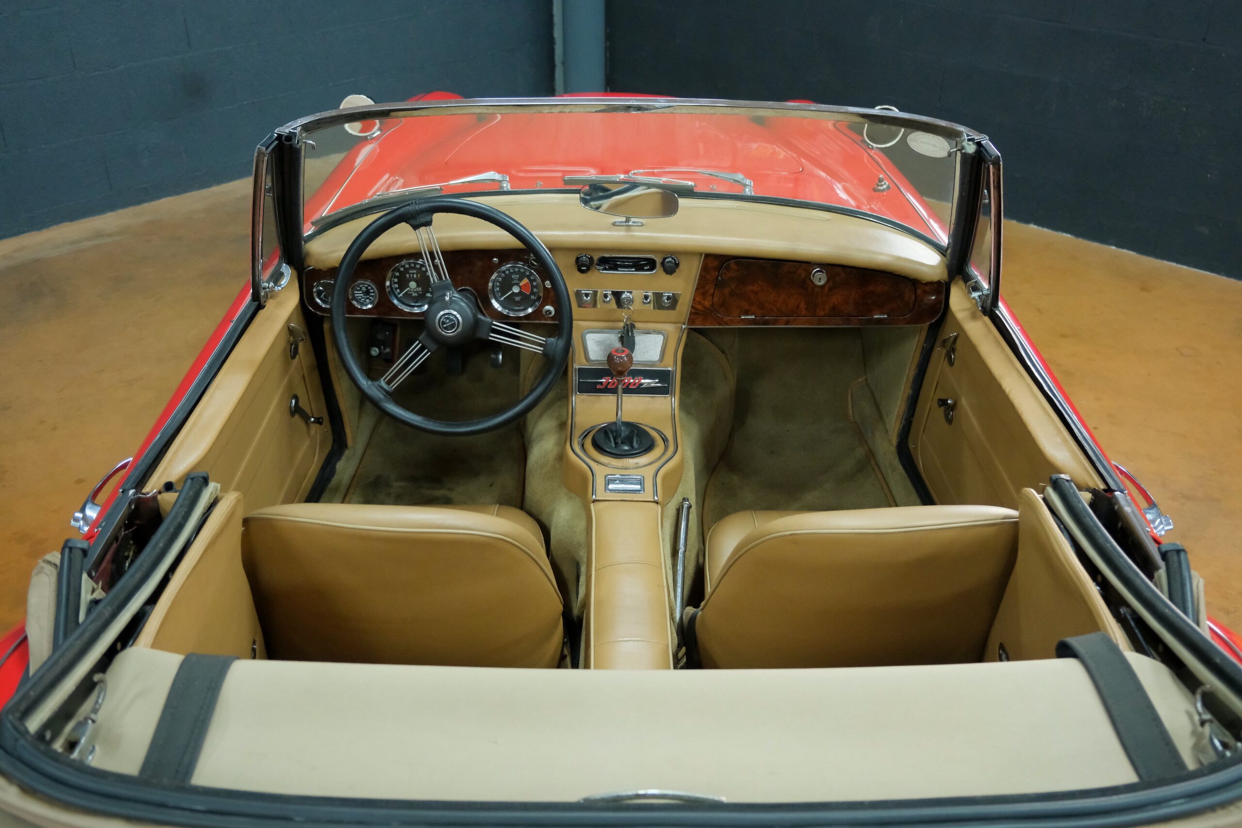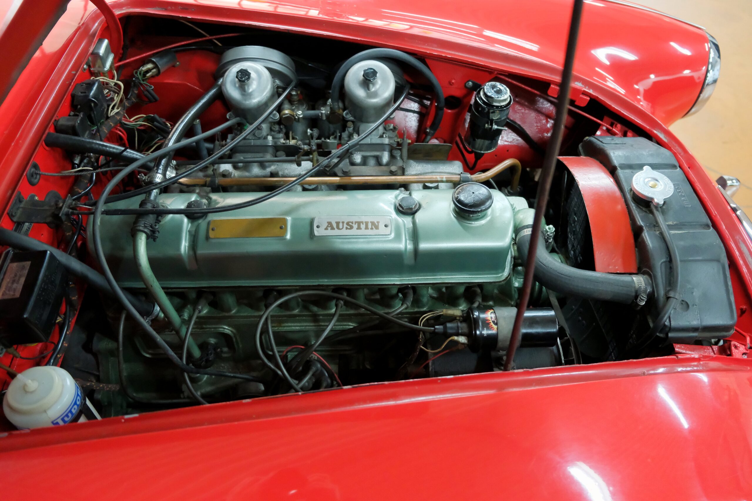 Considérée comme la plus confortable et la plus luxueuse des Austin Healey, c’est une toute dernière version des modèles 3000 que nous vous présentons : une 3000 MK3 BJ8 de deuxième phase. Version BJ8, c’est ainsi une 4 places et est équipée du moteur 6 cylindres en ligne de 148 chevaux. La phase 2 présente certaines différences esthétiques de la phase 1 : les indicateurs de direction sont séparés des feux de position et les disques de frein ont un diamètre plus grand.