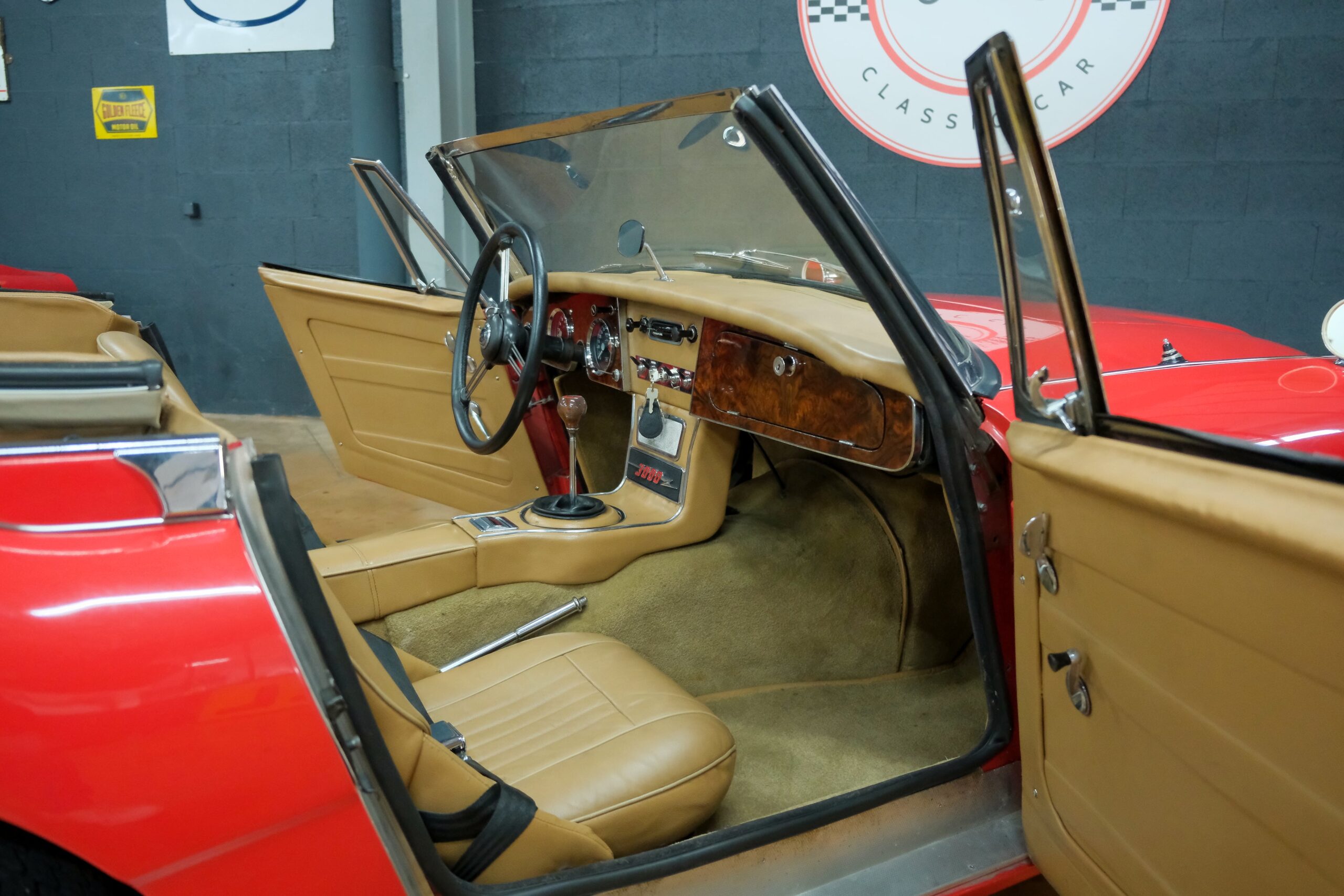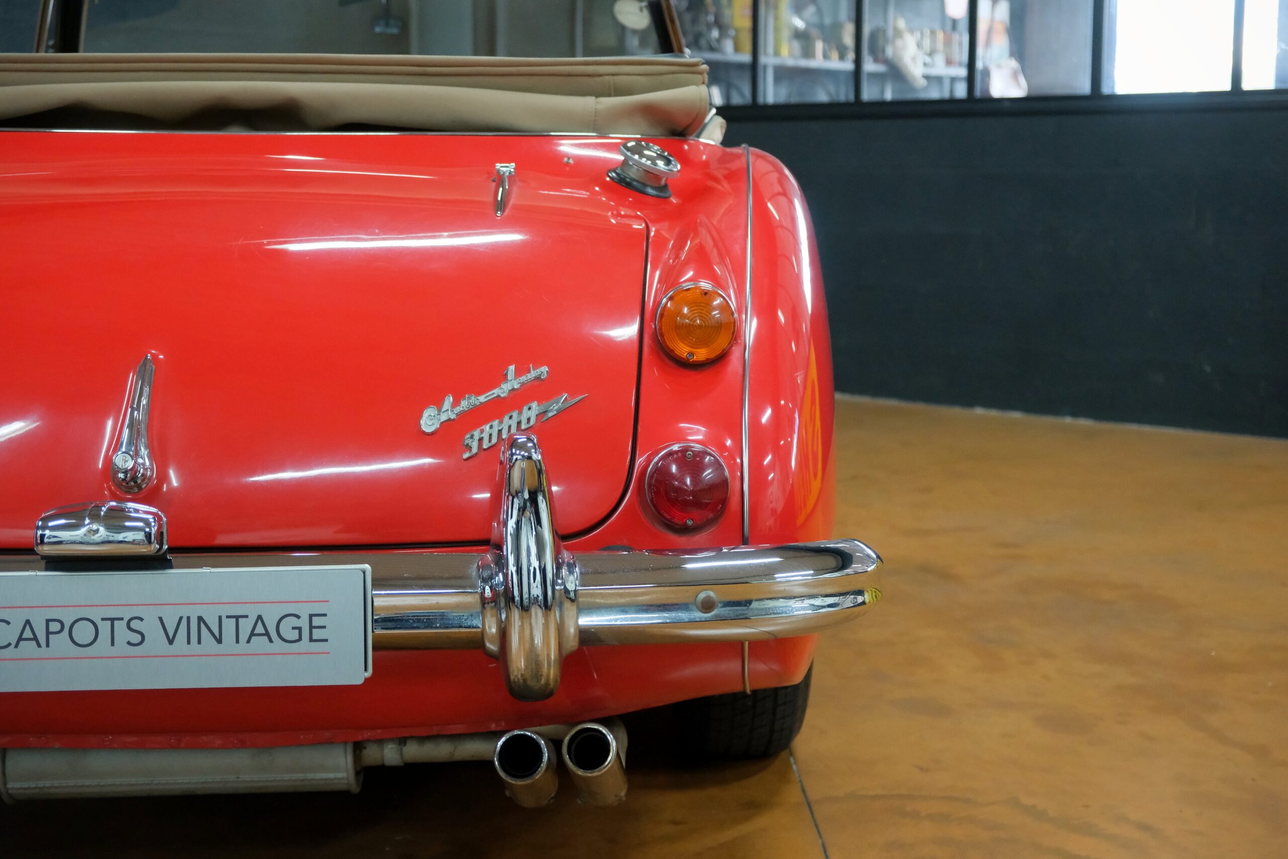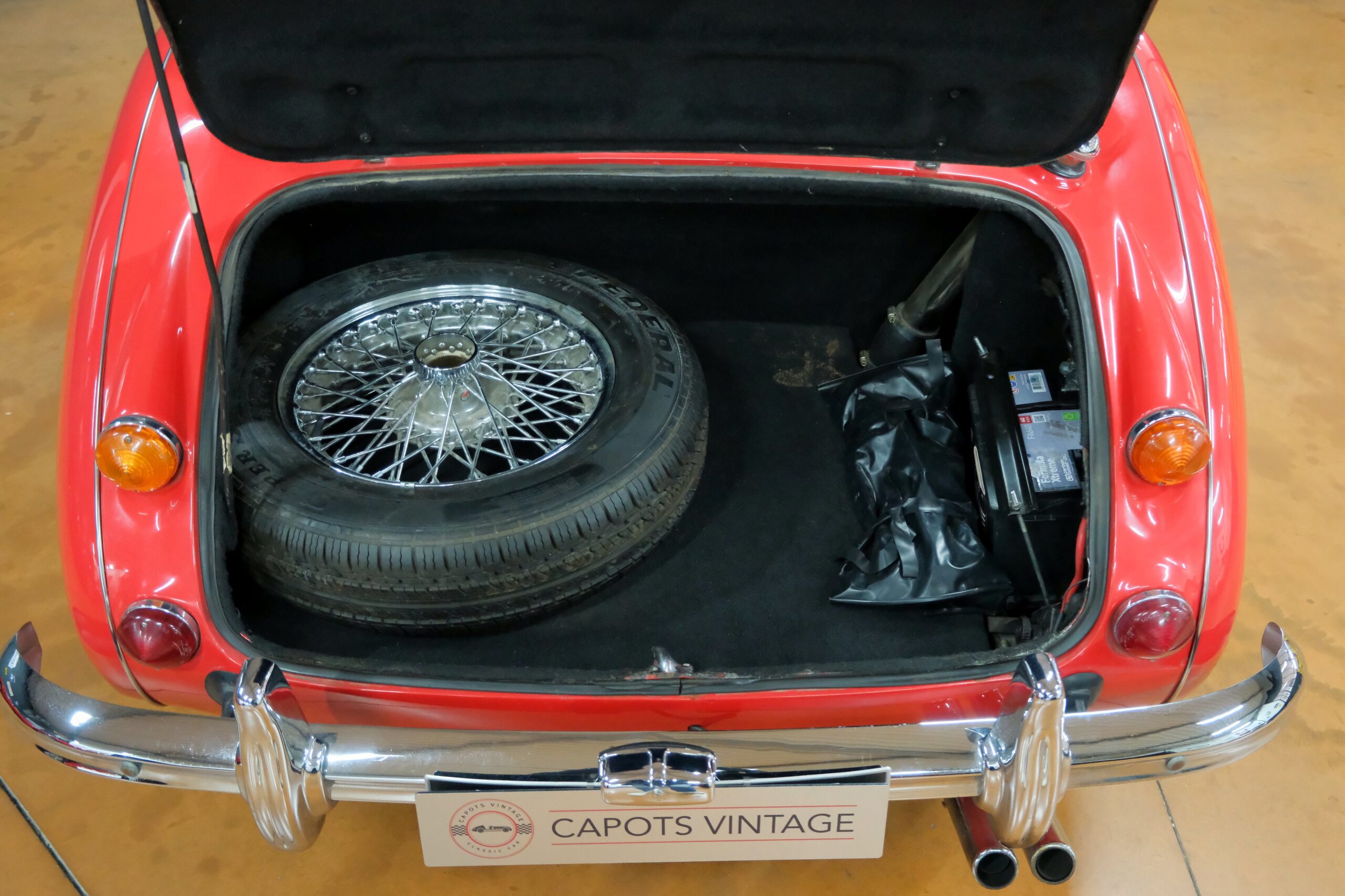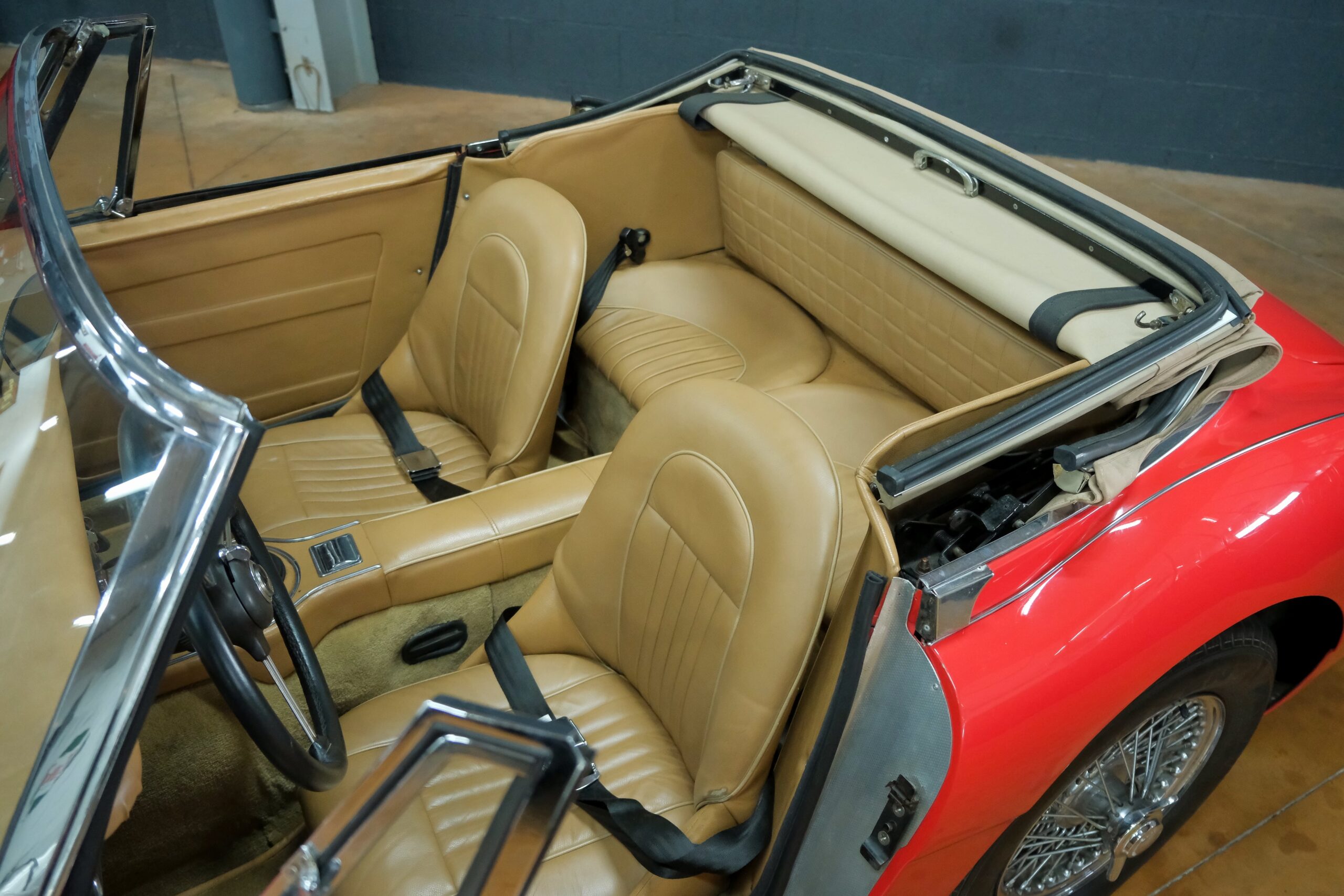 Considérée comme la plus confortable et la plus luxueuse des Austin Healey, c’est une toute dernière version des modèles 3000 que nous vous présentons : une 3000 MK3 BJ8 de deuxième phase. Version BJ8, c’est ainsi une 4 places et est équipée du moteur 6 cylindres en ligne de 148 chevaux. La phase 2 présente certaines différences esthétiques de la phase 1 : les indicateurs de direction sont séparés des feux de position et les disques de frein ont un diamètre plus grand.