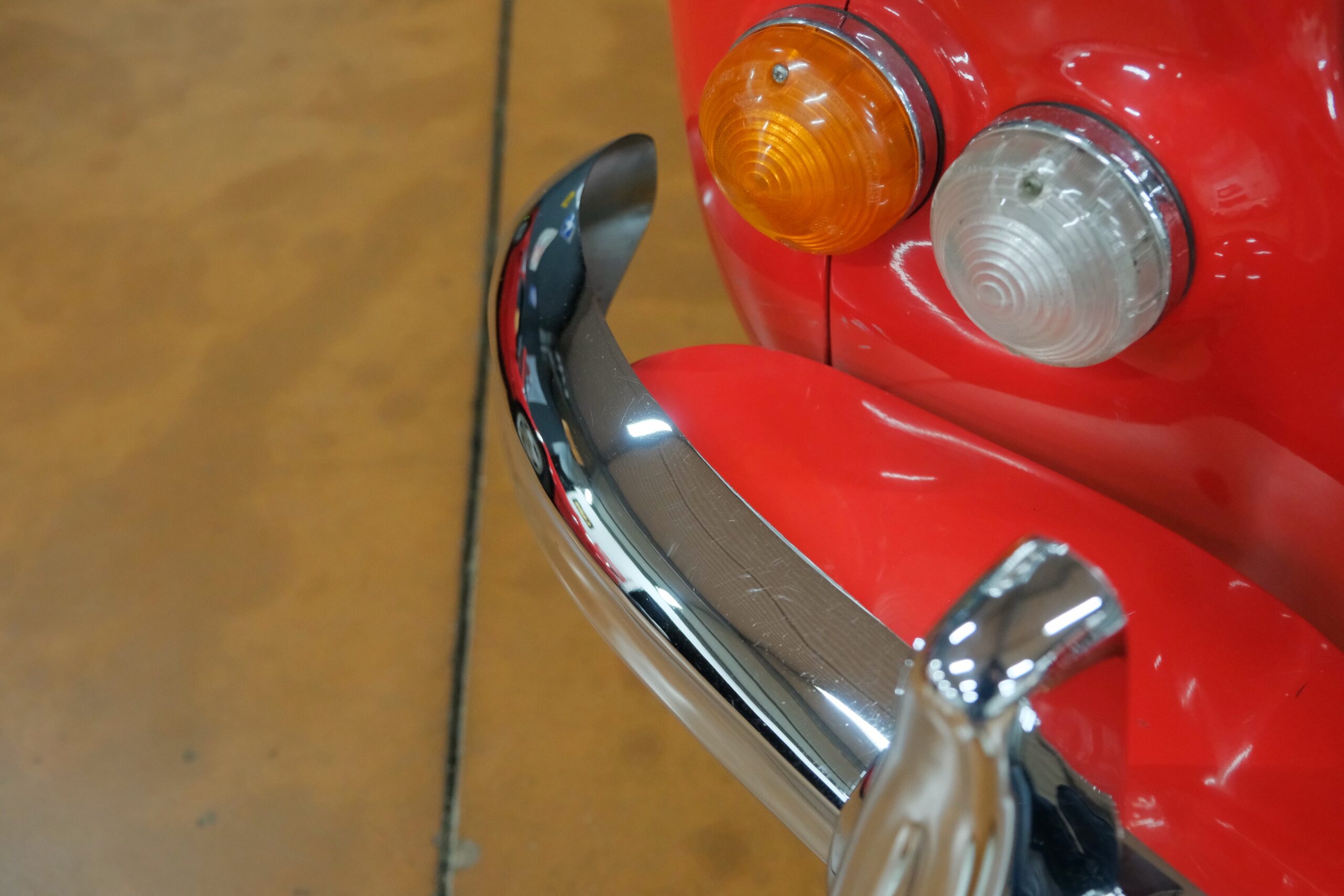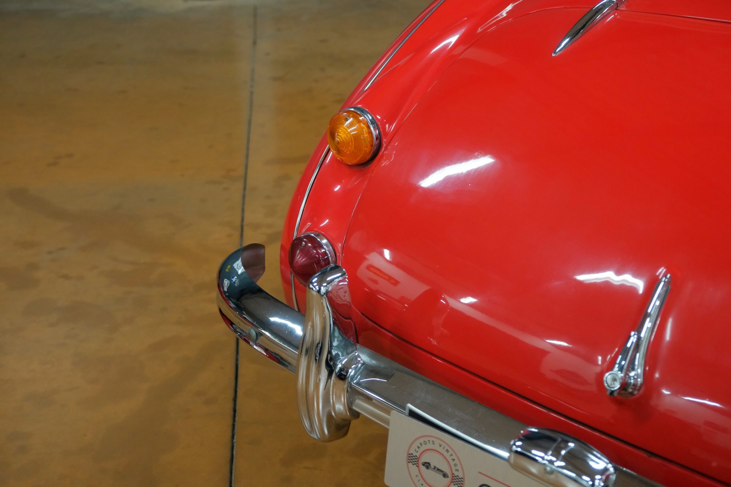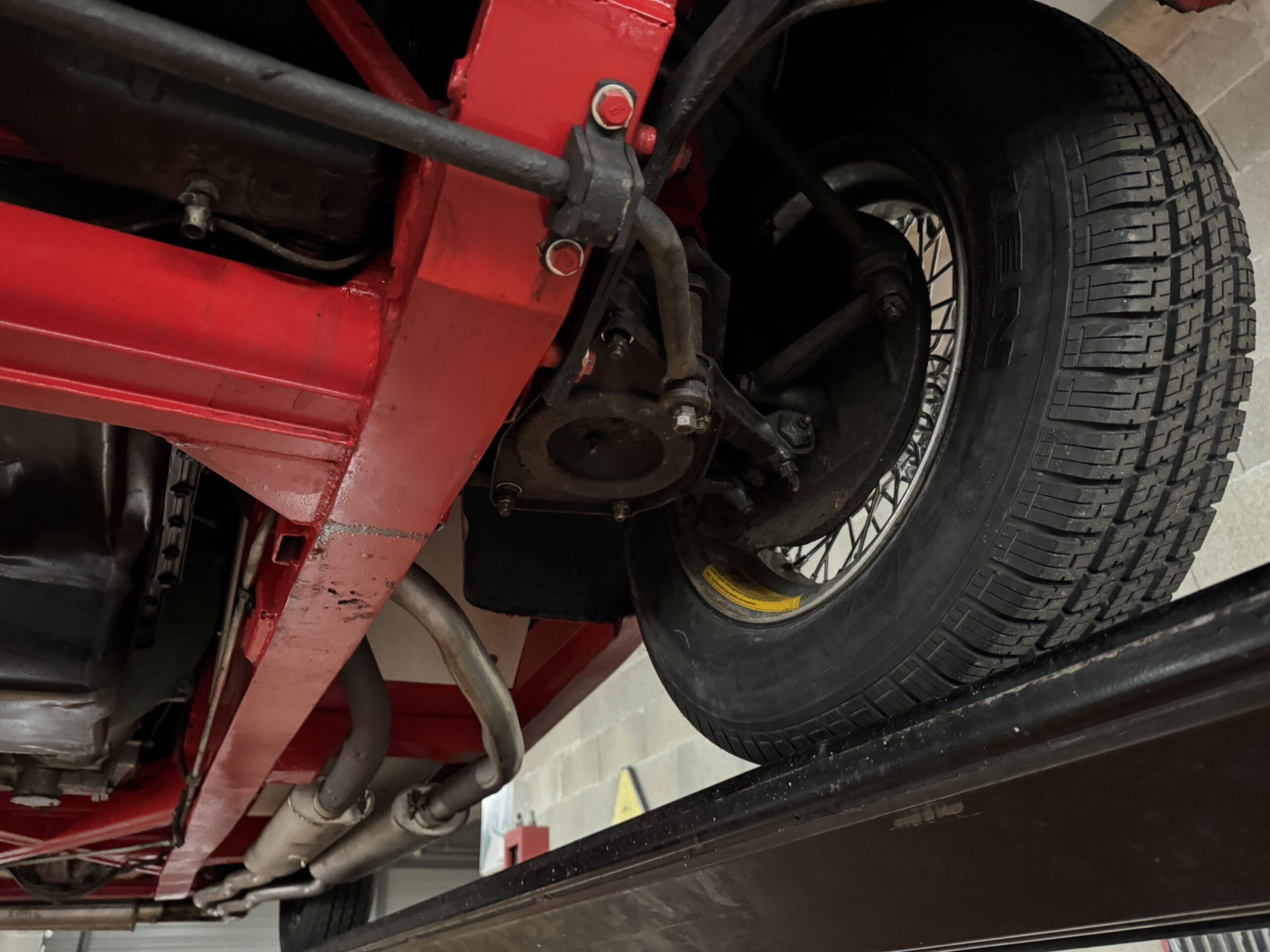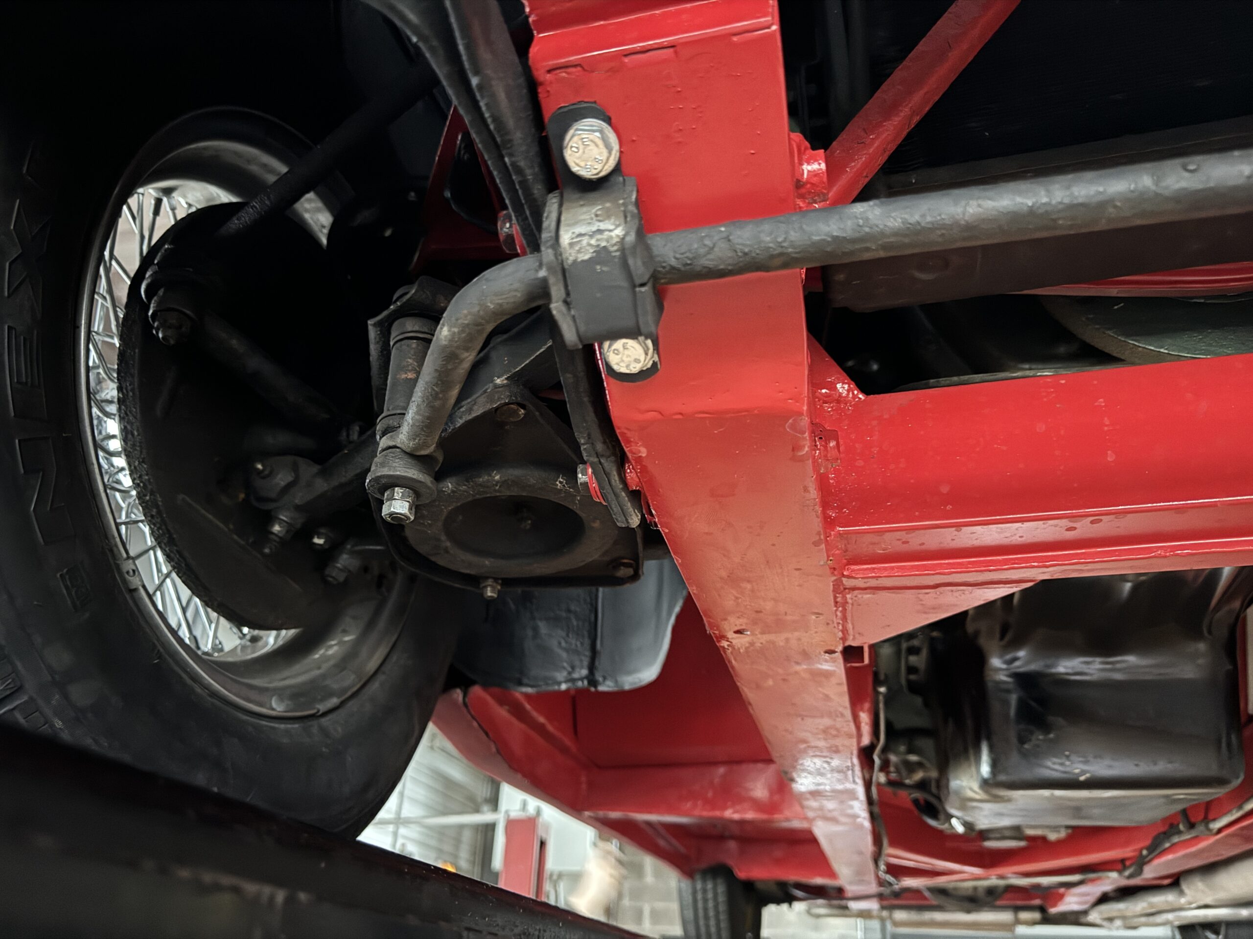 La carrosserie, absolument superbe, a été refaite intégralement par un spécialiste en 2019. L’ensemble des chromes: Calandre,pare-chocs avant et arrière sont en excellent état. Les pneus en très bon état sont montés sur 4 roues à rayons chromées avec Knock off.
