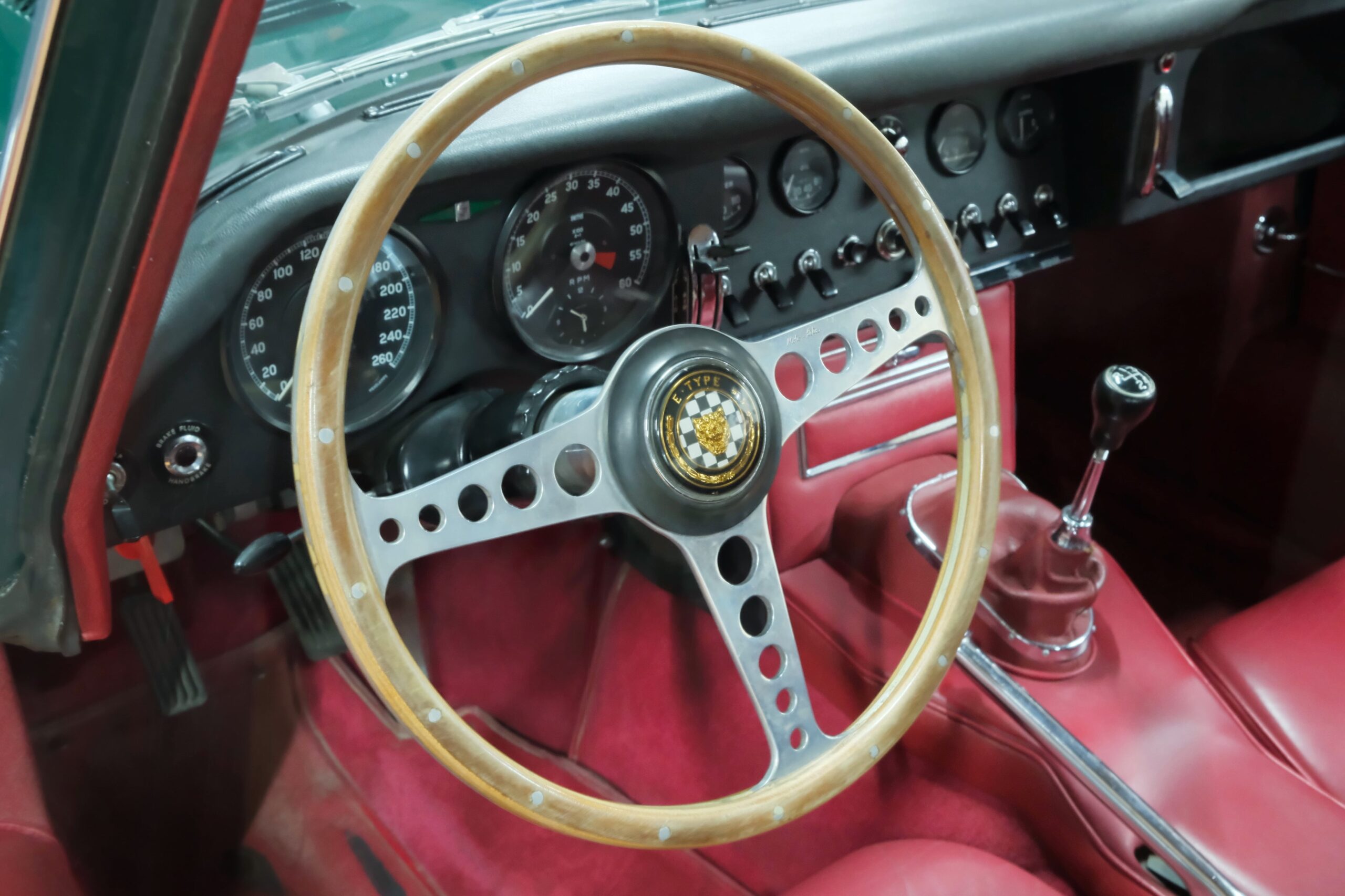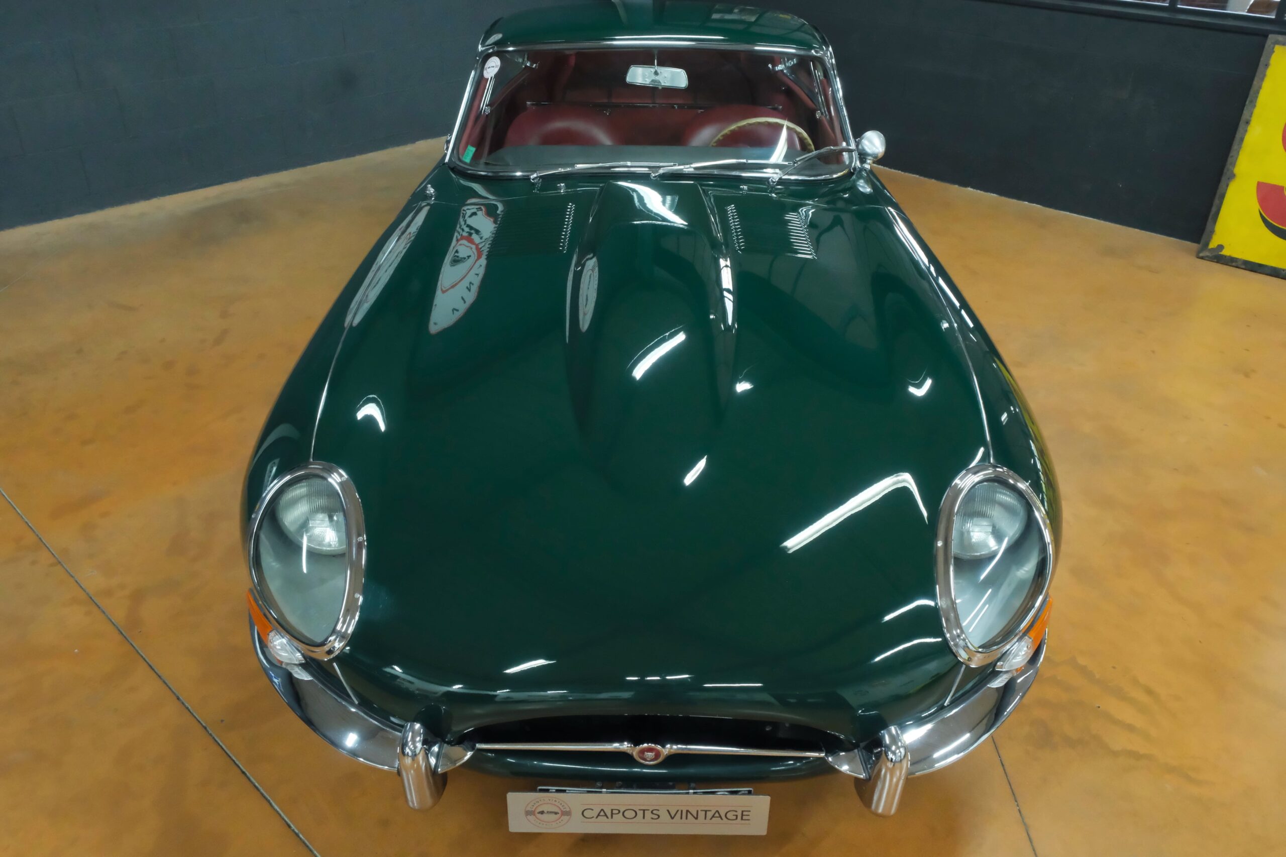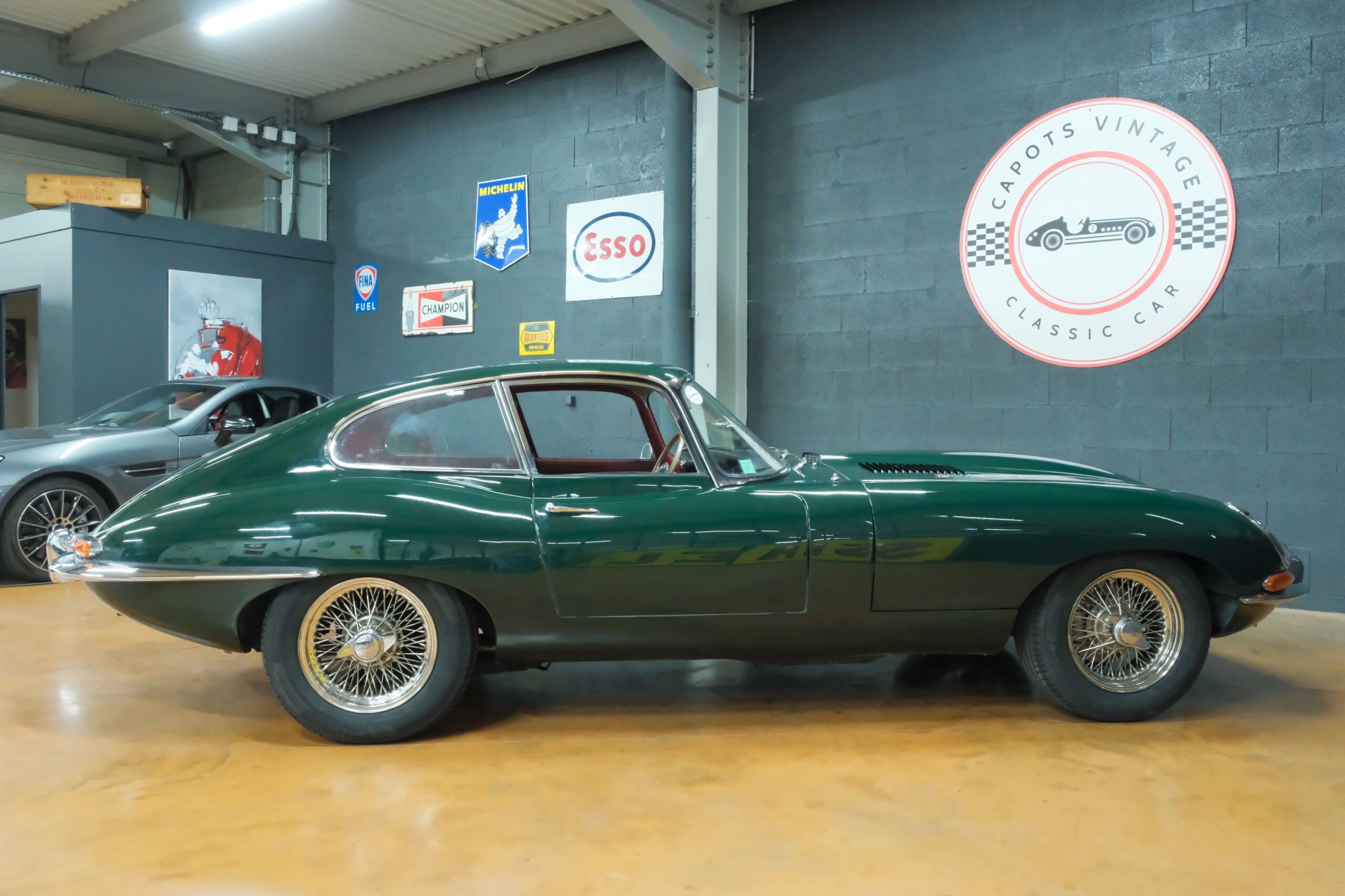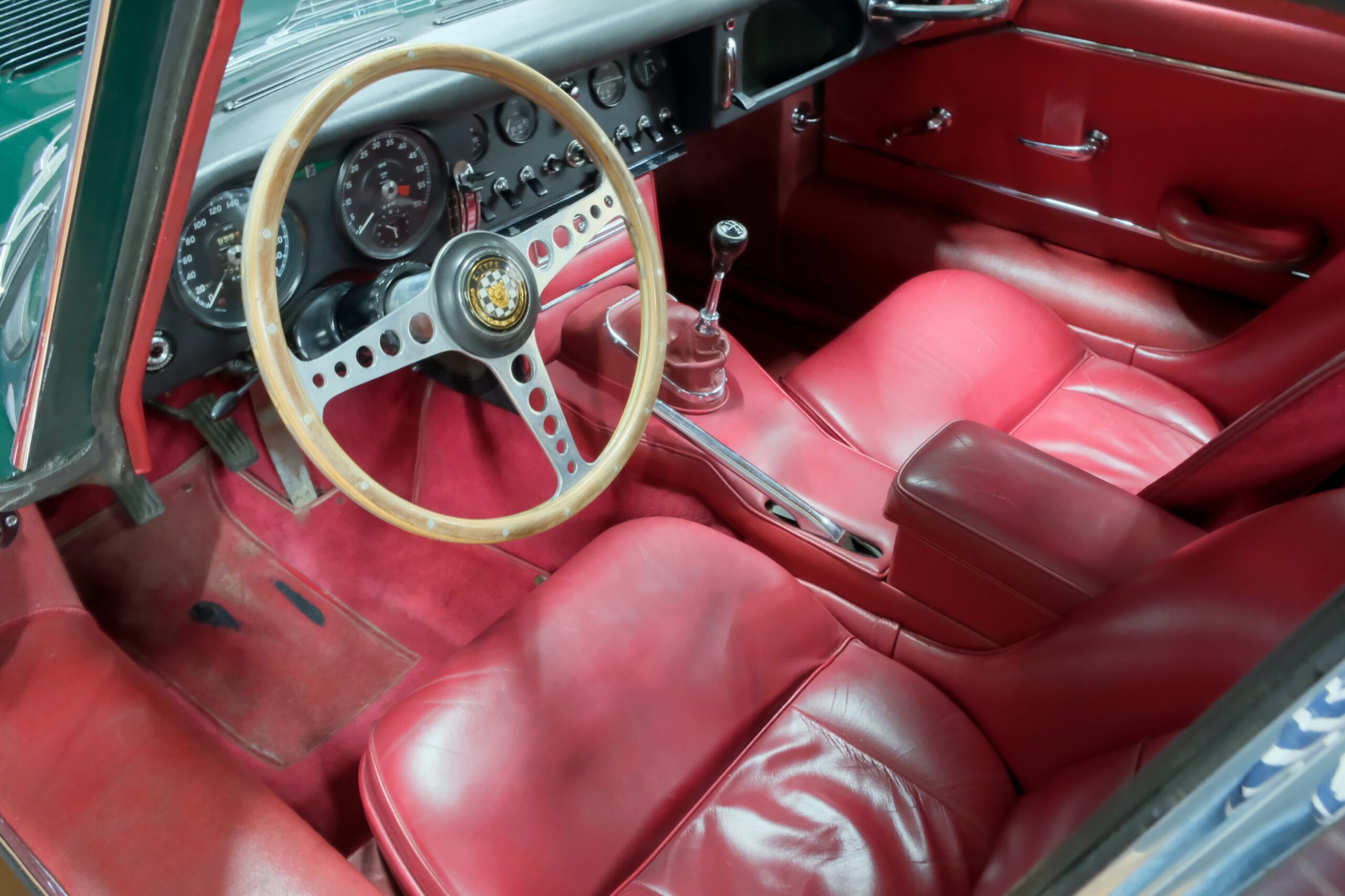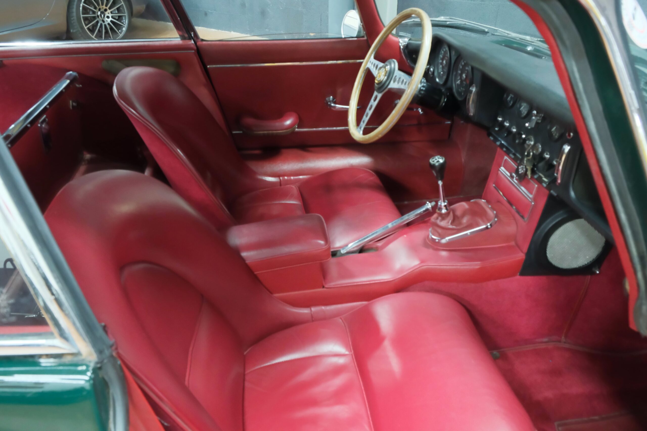 Cet exemplaire se présente aujourd’hui dans une teinte British Racing Green associée à un intérieur en cuir Bordeaux, un mariage sobre et harmonieux qui souligne la finesse du dessin de Malcolm Sayer. Le moteur, matching numbers (bloc et culasse) alimenté par trois carburateurs SU horizontaux, développe 265 ch et offre des performances encore impressionnantes, avec une sonorité typique du six-cylindres Jaguar accentué par l’échappement « inox Big-Bore ». L’auto a appartenu au même propriétaire pendant plus de cinquante ans, preuve d’un entretien rigoureux et d’un soin attentif. Elle a fait l’objet d’une restauration complète par un spécialiste parisien il y a douze ans, incluant la carrosserie, la sellerie et la mécanique.