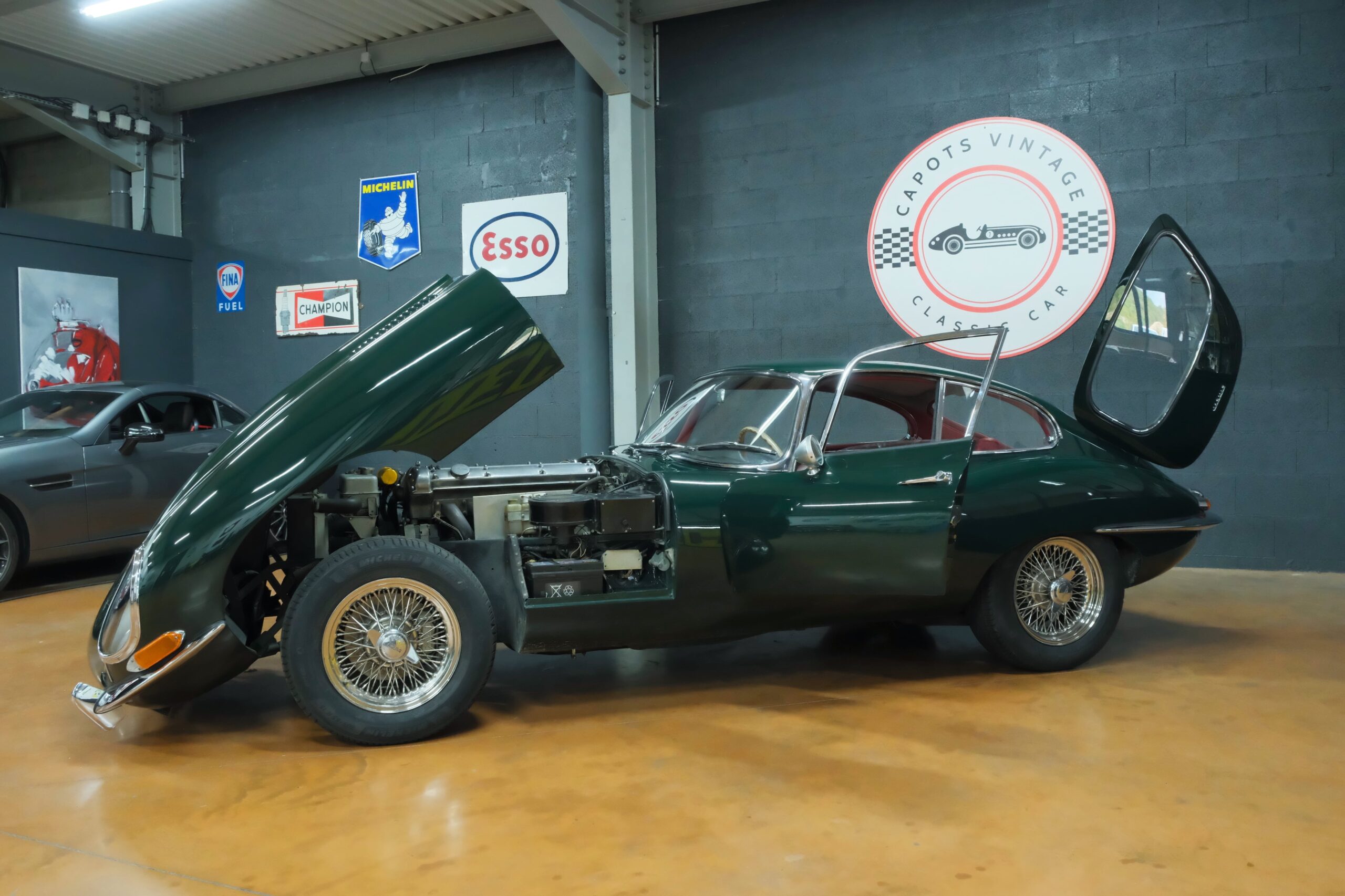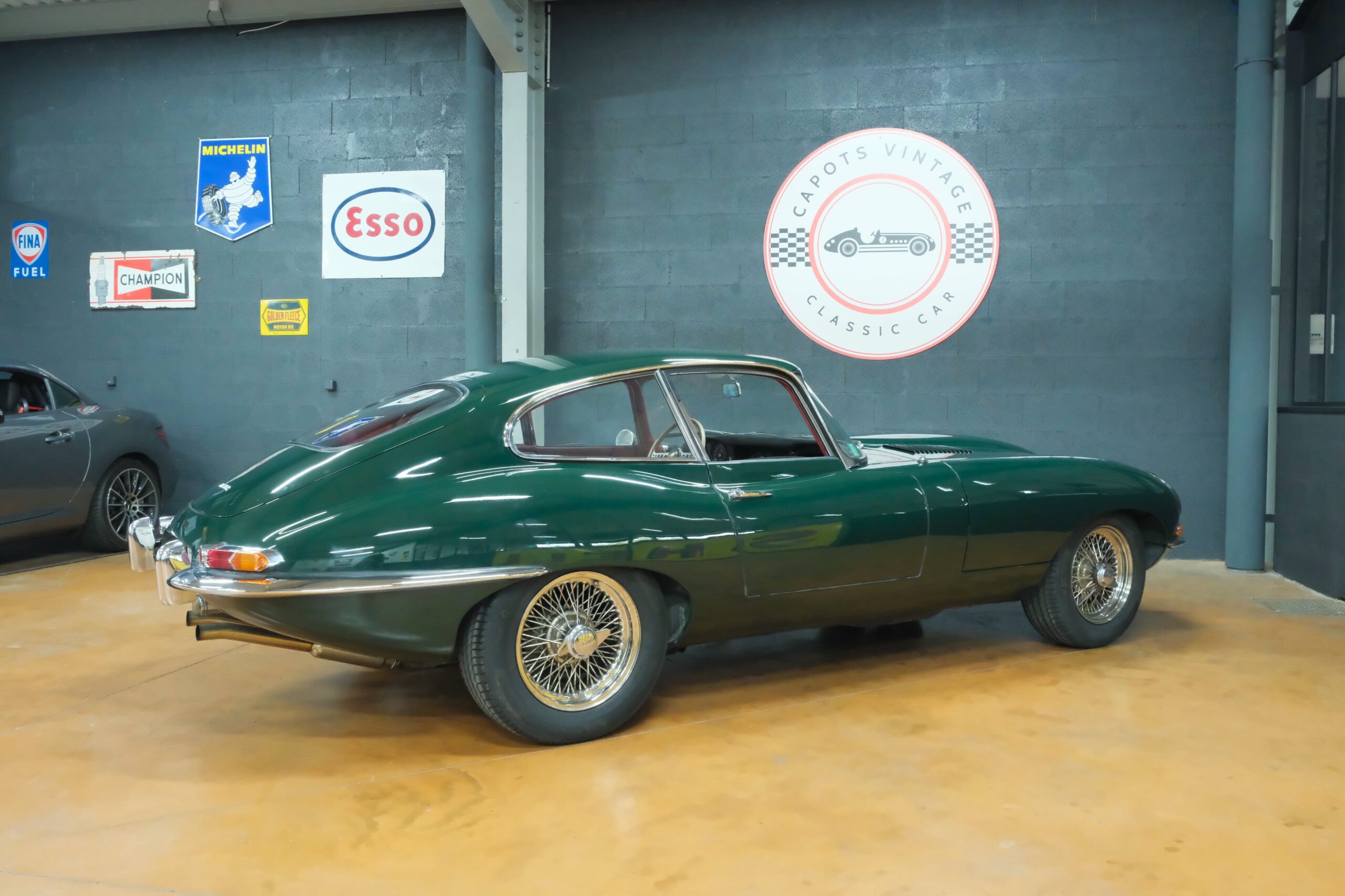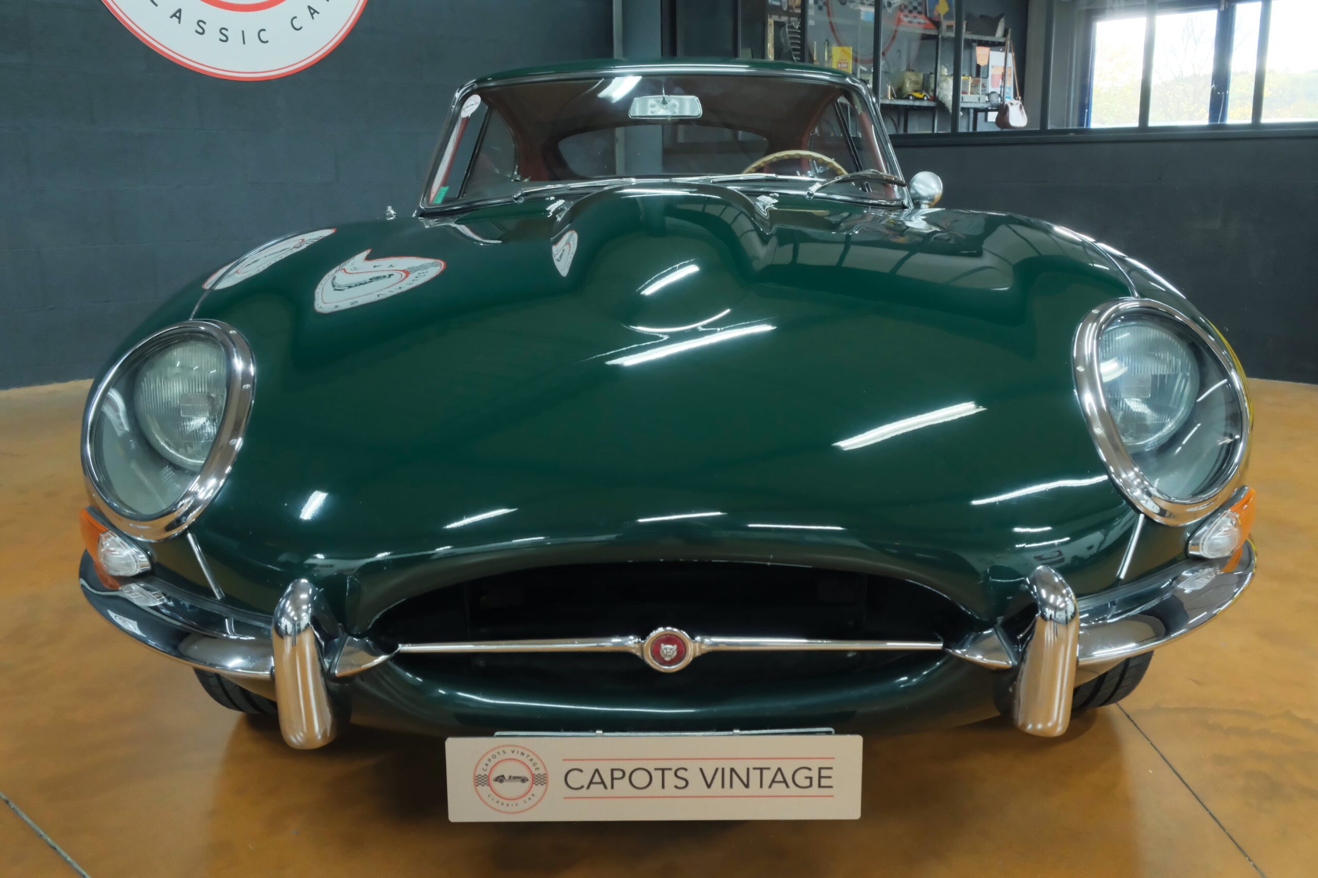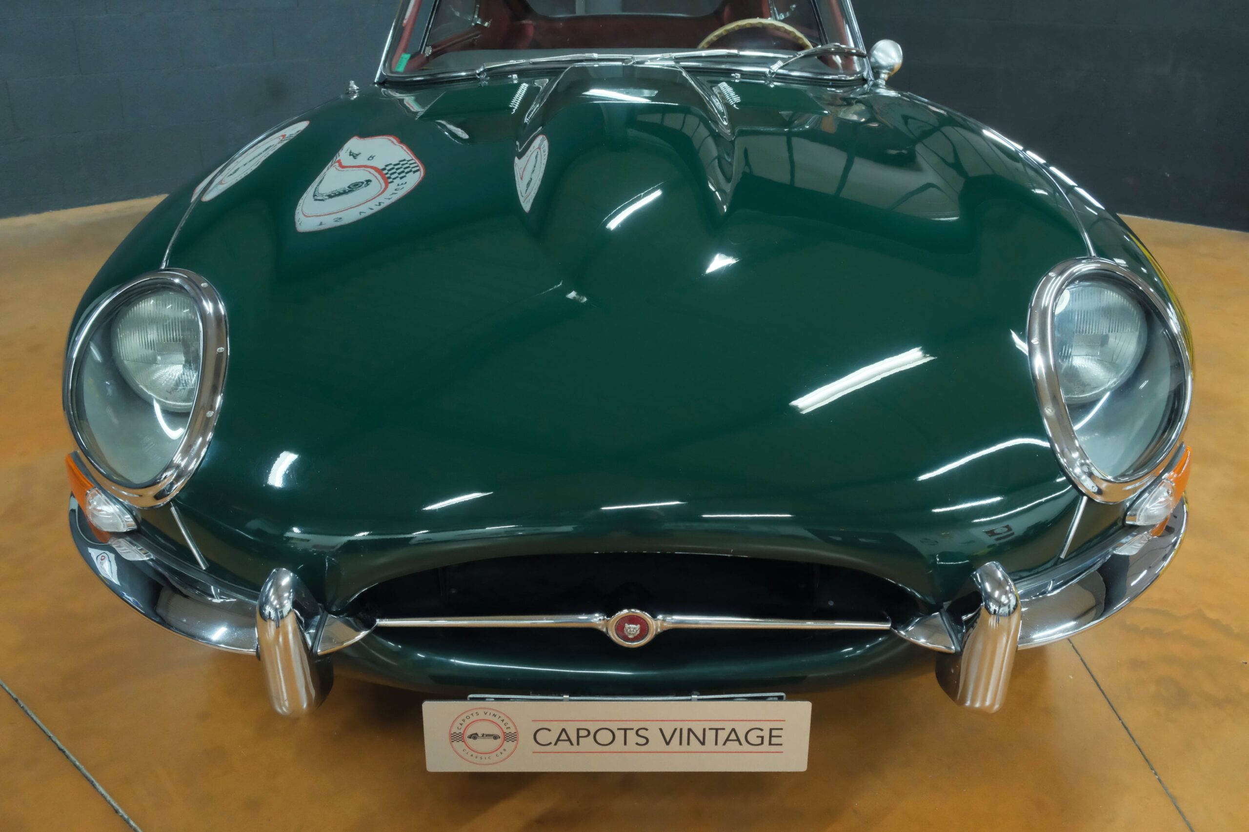 Cet exemplaire se présente aujourd’hui dans une teinte British Racing Green associée à un intérieur en cuir Bordeaux, un mariage sobre et harmonieux qui souligne la finesse du dessin de Malcolm Sayer. Le moteur, matching numbers (bloc et culasse) alimenté par trois carburateurs SU horizontaux, développe 265 ch et offre des performances encore impressionnantes, avec une sonorité typique du six-cylindres Jaguar accentué par l’échappement « inox Big-Bore ». L’auto a appartenu au même propriétaire pendant plus de cinquante ans, preuve d’un entretien rigoureux et d’un soin attentif. Elle a fait l’objet d’une restauration complète par un spécialiste parisien il y a douze ans, incluant la carrosserie, la sellerie et la mécanique.
