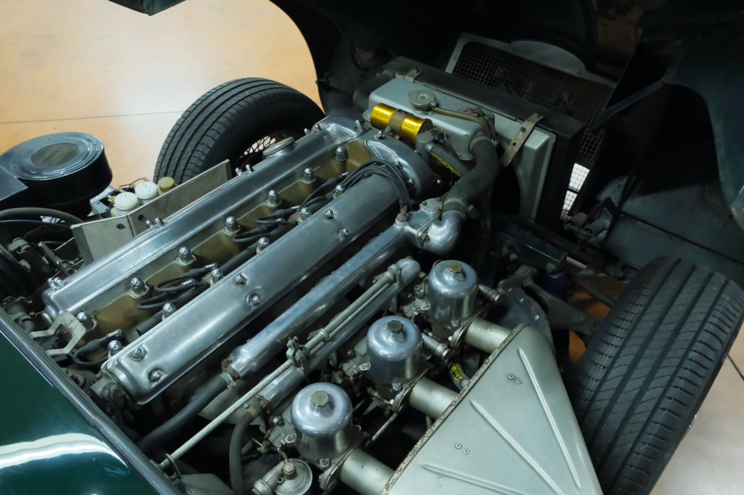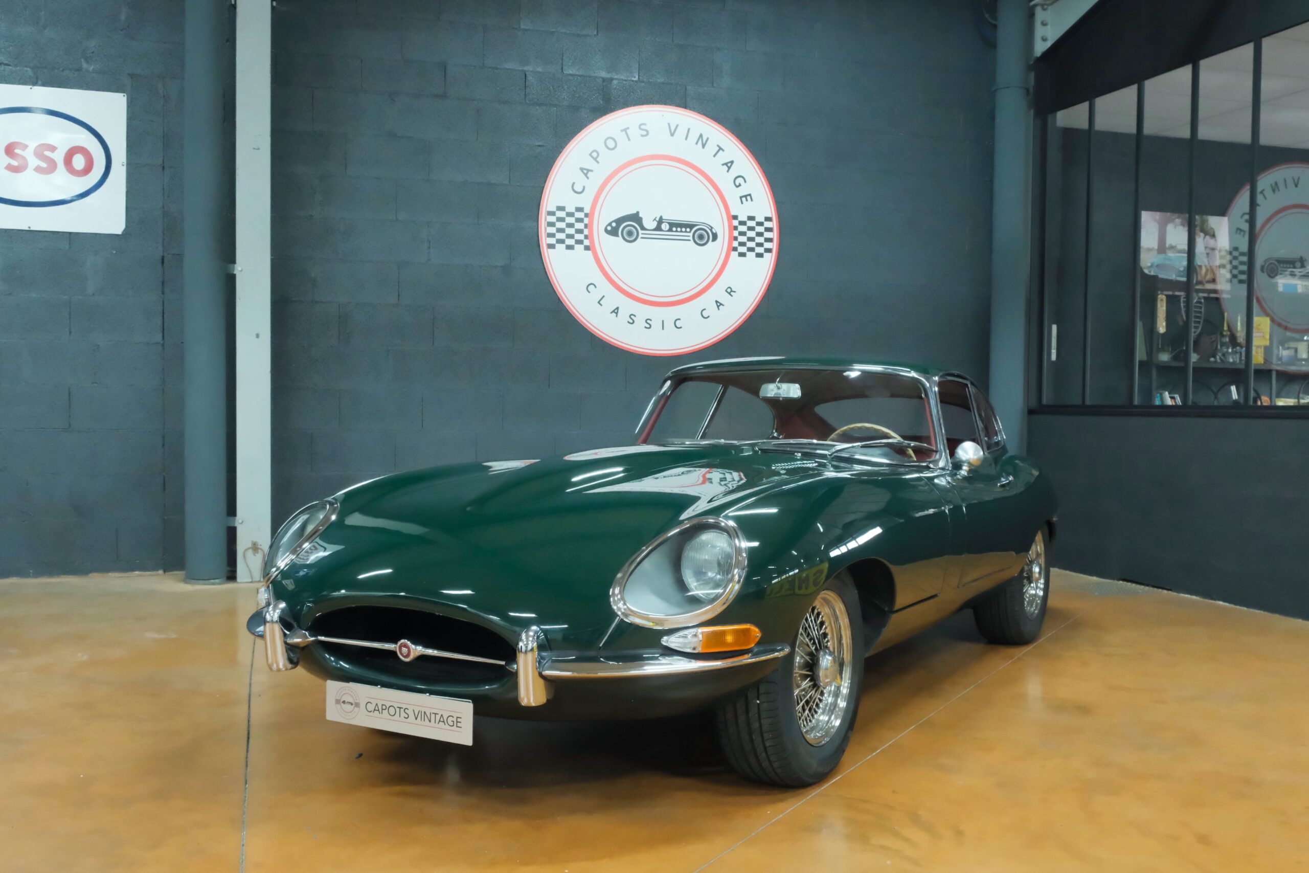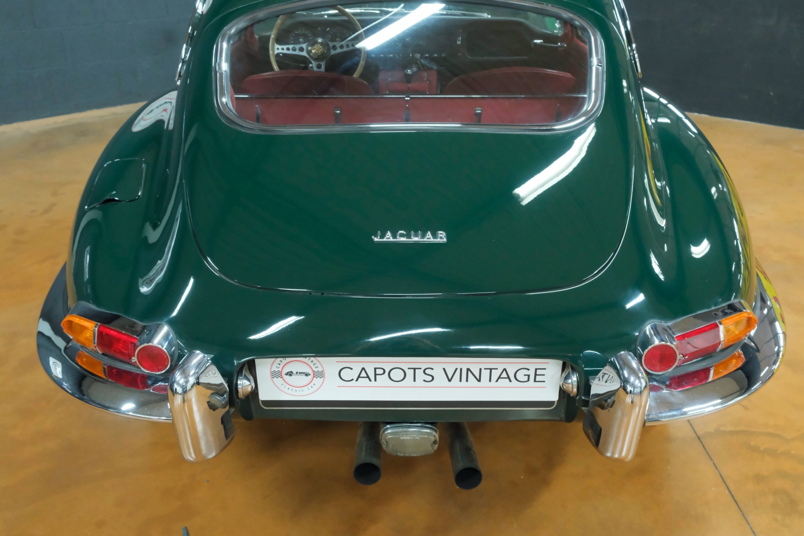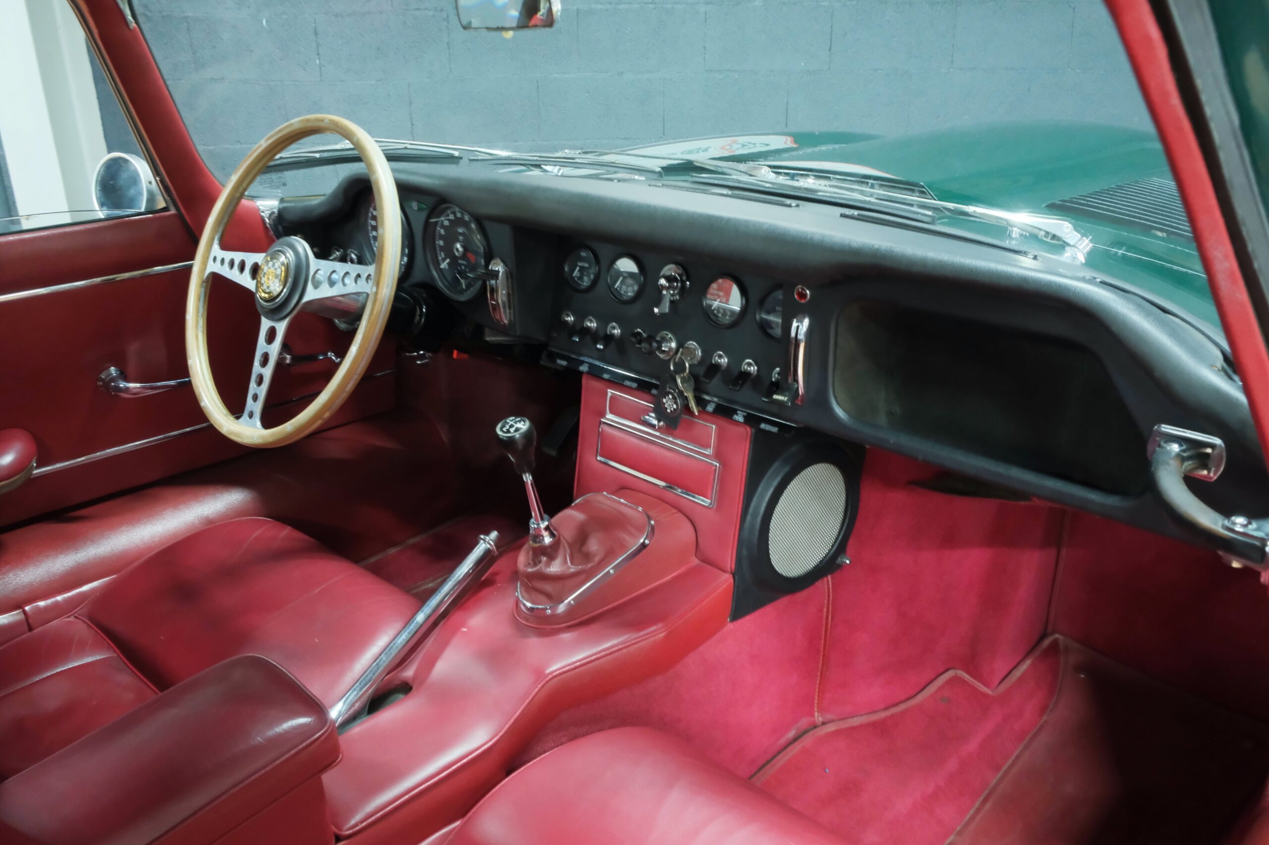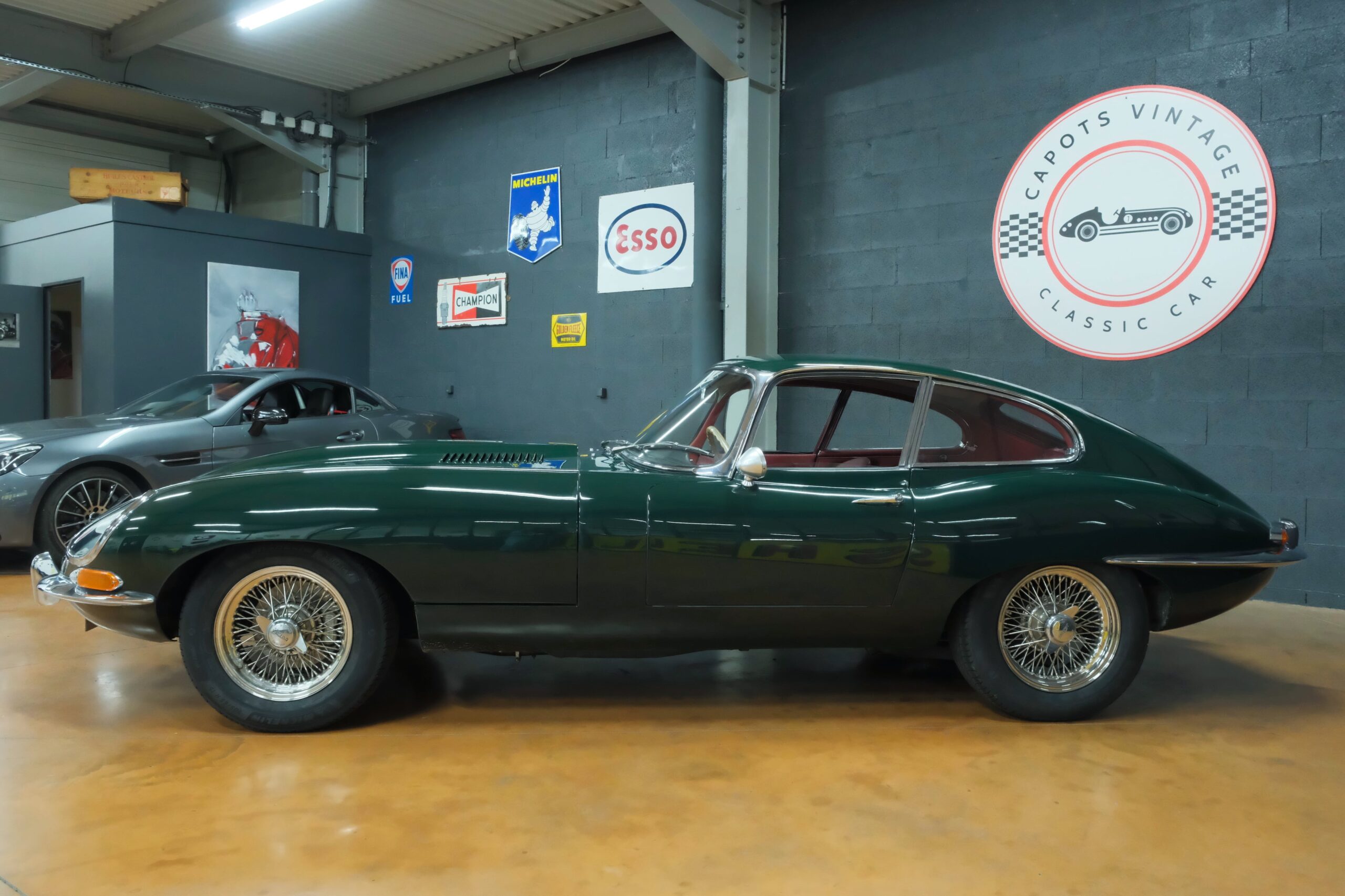 Cet exemplaire se présente aujourd’hui dans une teinte British Racing Green associée à un intérieur en cuir Bordeaux, un mariage sobre et harmonieux qui souligne la finesse du dessin de Malcolm Sayer. Le moteur, matching numbers (bloc et culasse) alimenté par trois carburateurs SU horizontaux, développe 265 ch et offre des performances encore impressionnantes, avec une sonorité typique du six-cylindres Jaguar accentué par l’échappement « inox Big-Bore ». L’auto a appartenu au même propriétaire pendant plus de cinquante ans, preuve d’un entretien rigoureux et d’un soin attentif. Elle a fait l’objet d’une restauration complète par un spécialiste parisien il y a douze ans, incluant la carrosserie, la sellerie et la mécanique.