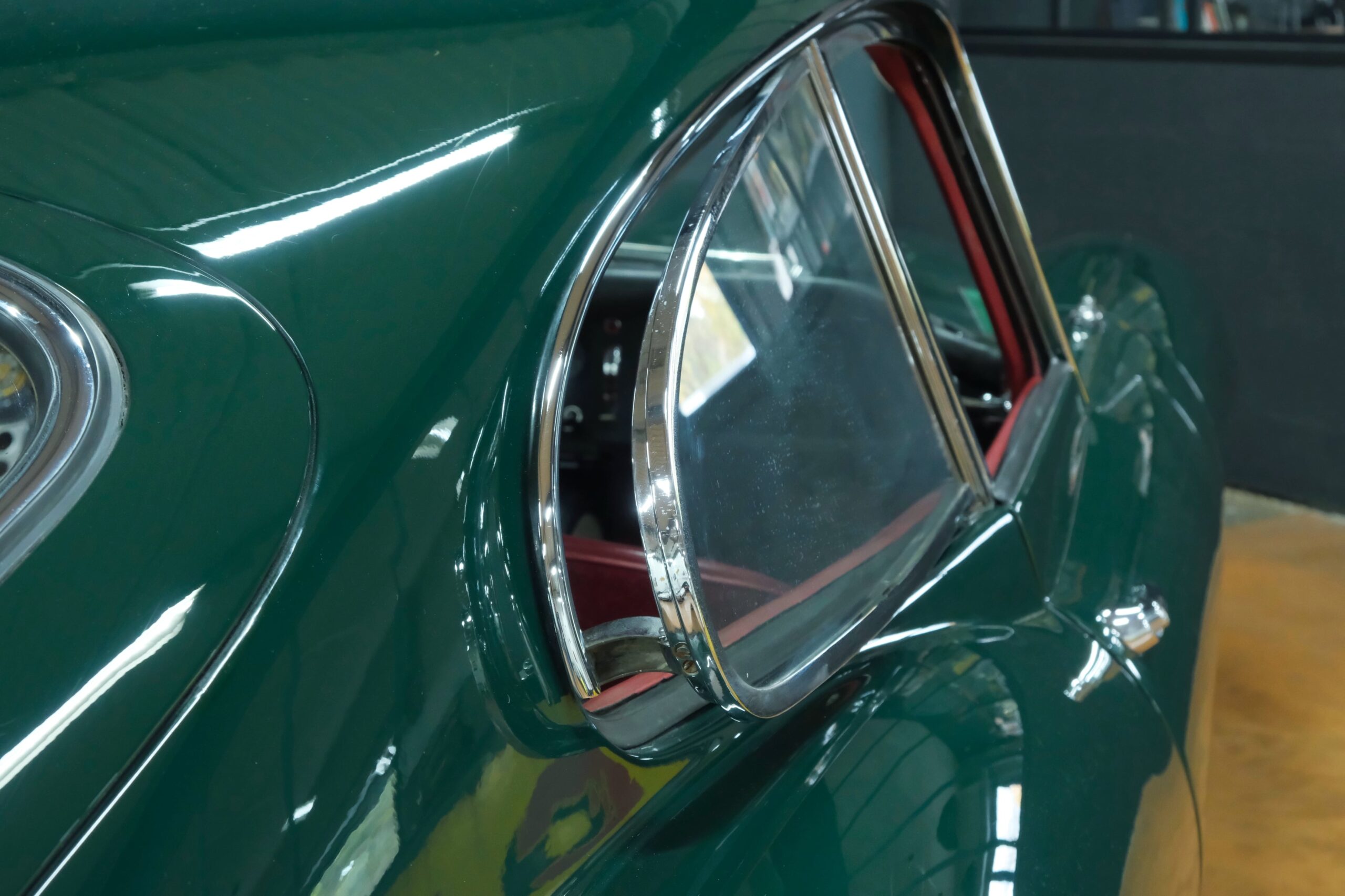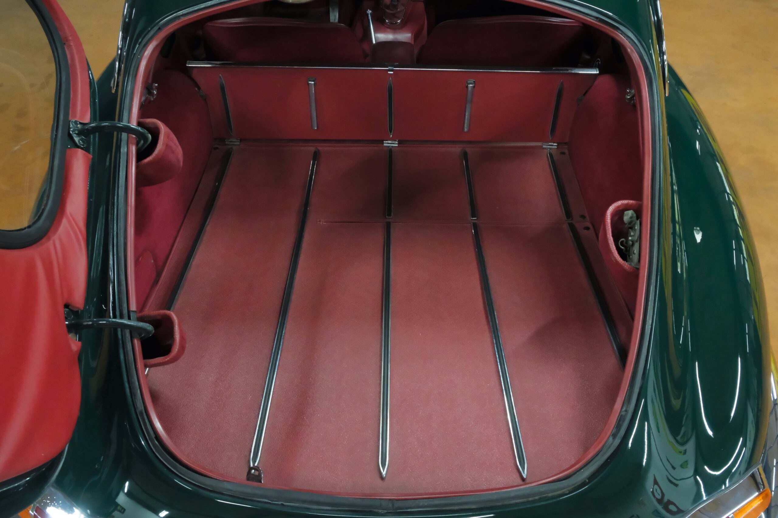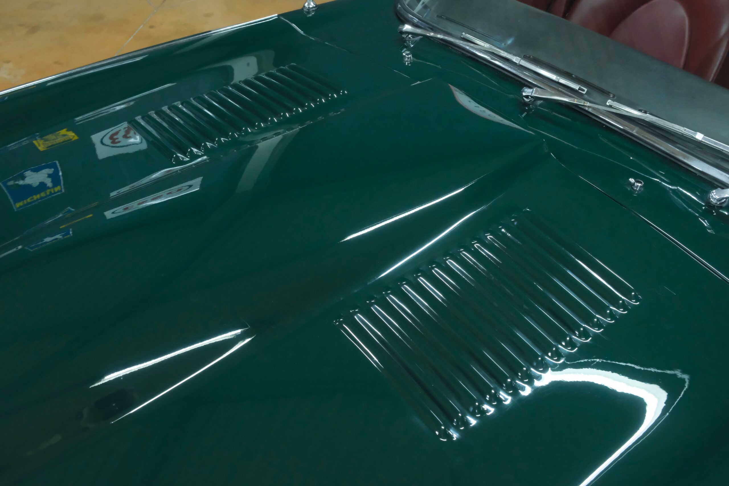 La carrosserie British Racing Green est en parfait état, l’ensemble des pare-chocs et des chromes sont parfaits.