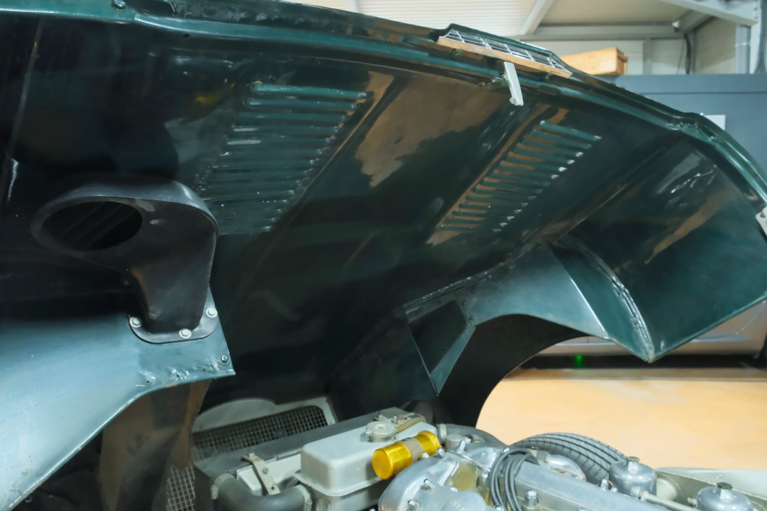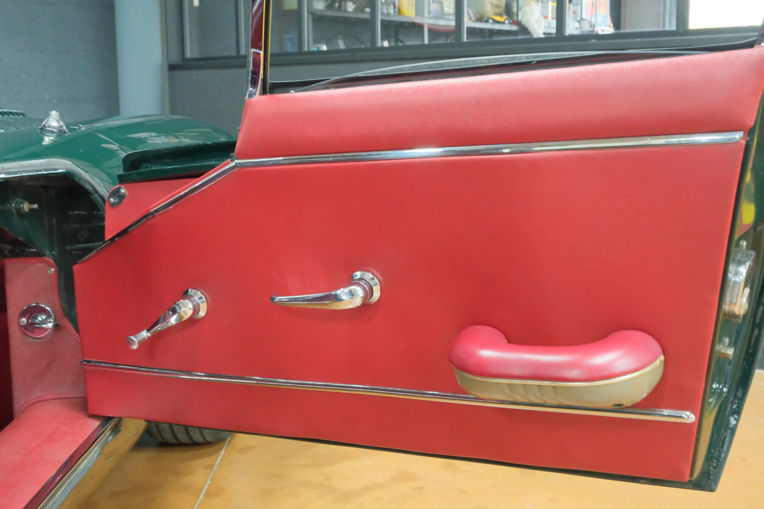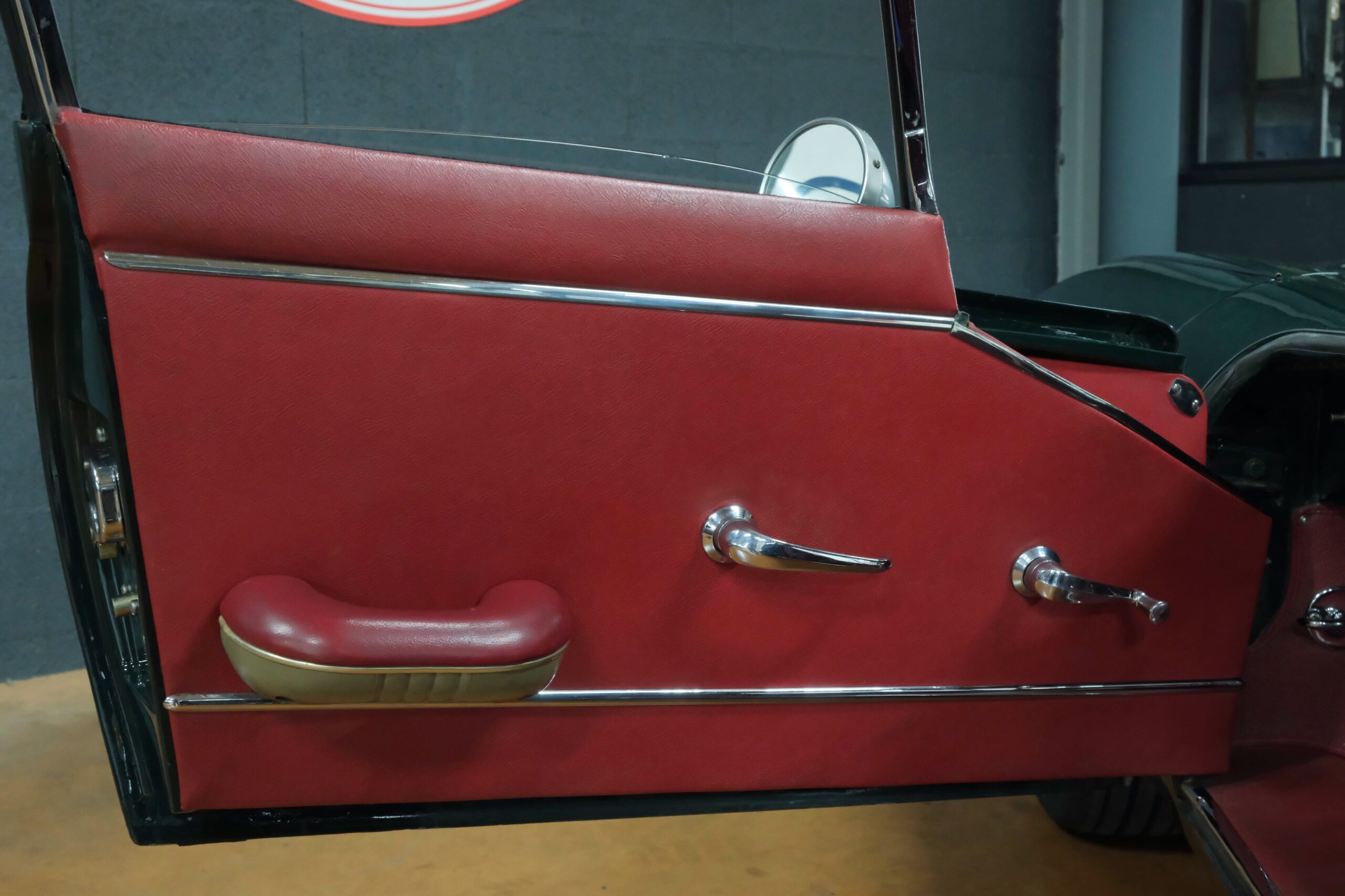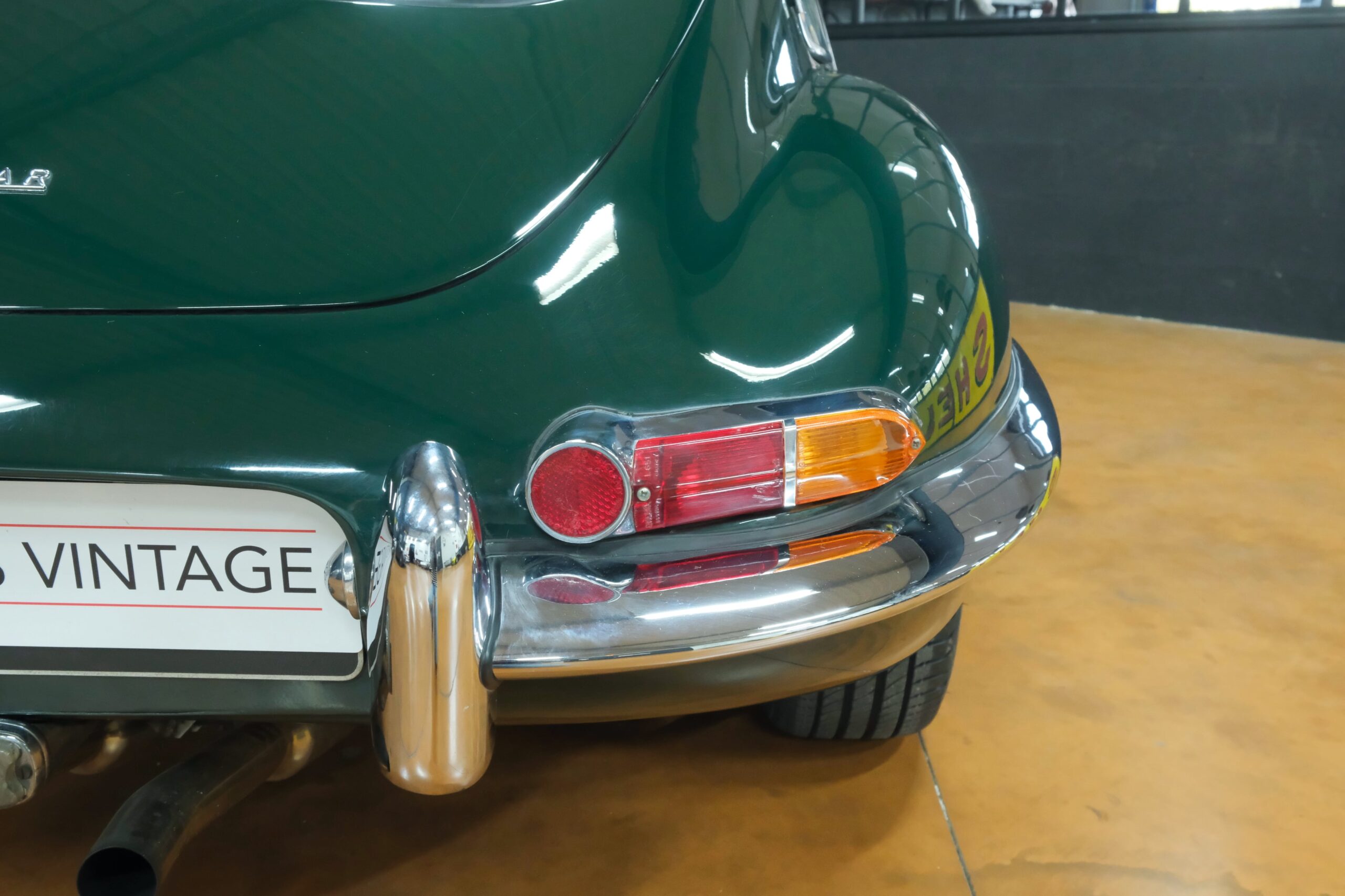 La carrosserie British Racing Green est en parfait état, l’ensemble des pare-chocs et des chromes sont parfaits.
