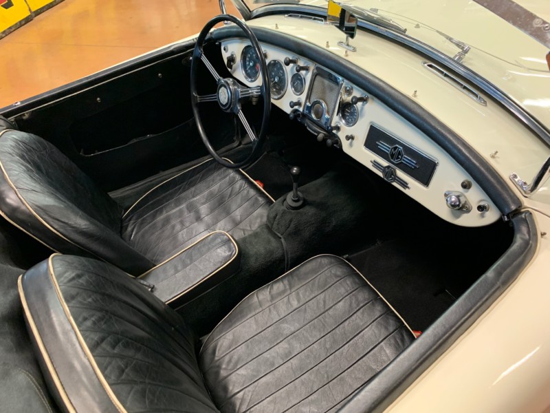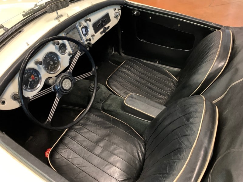 Nous vous proposons un beau roadster anglais, la MGA 1500 cabriolet dans sa couleur d’origine : Old English White avec un intérieur cuir noir et passepoil blanc. Cette voiture est une rare MGA Française (compteur en km/h) avec seulement 2 propriétaires entre 2000 et aujourd’hui. La voiture dispose de ses sides-screens, de sa capote avec arceau, du cover tonneau et d’un porte bagage chromé. Nous avons un dossier de factures. Une révision complète vient d’être effectuer dans nos ateliers. Dossier photos et vidéos sur demande. Véhicule vendu avec une garantie mécanique (moteur-boite-pont) 6 mois.