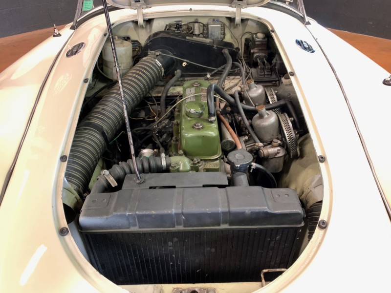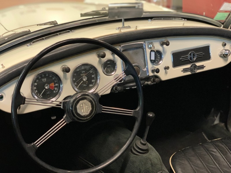 Repeinte il y’a 3 ans , La carrosserie de cette MGA est en bon état.L’ensemble des chromes sont en très bons états.Les pneus sont montés sur 4 roues fil chromés avec Knock off.