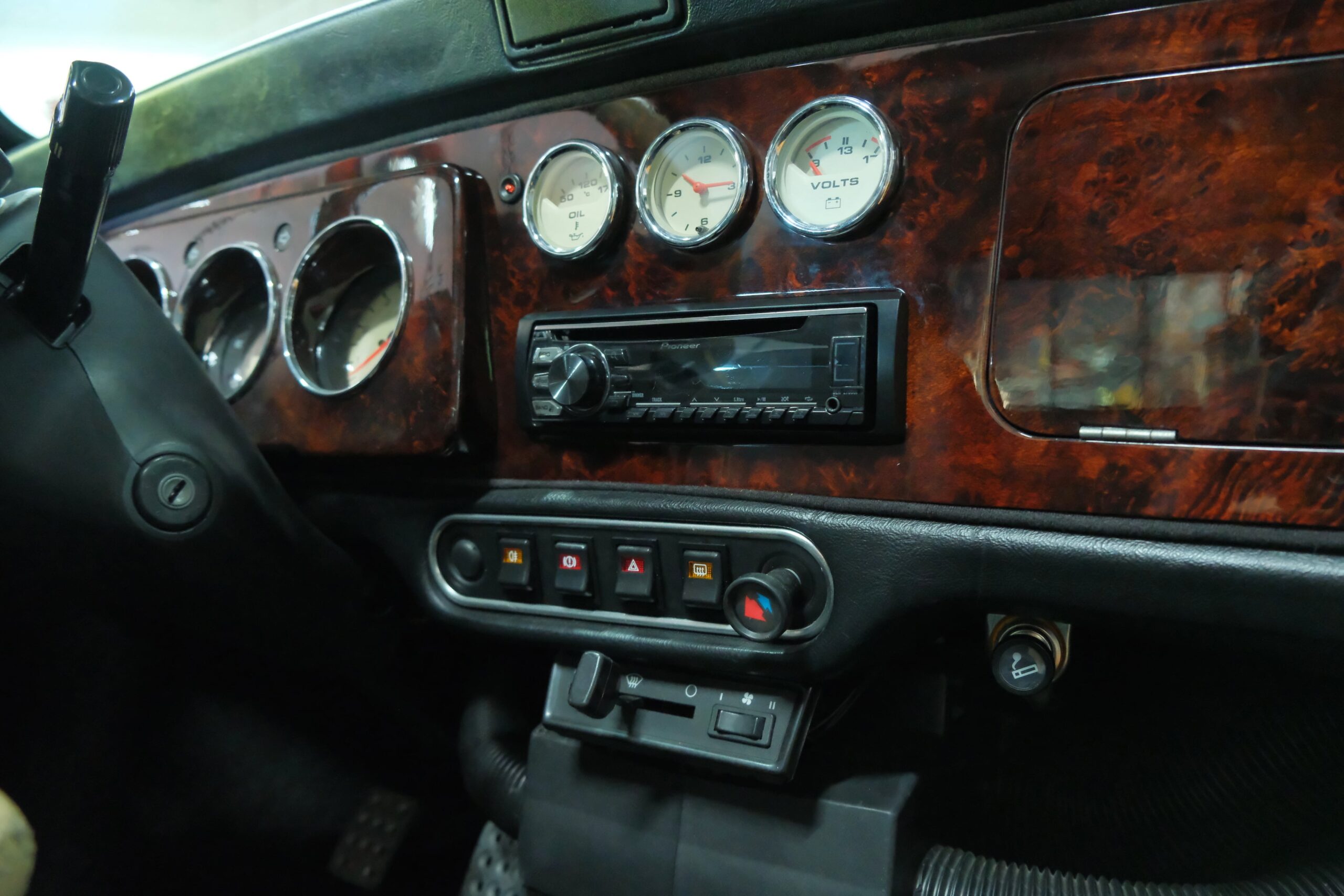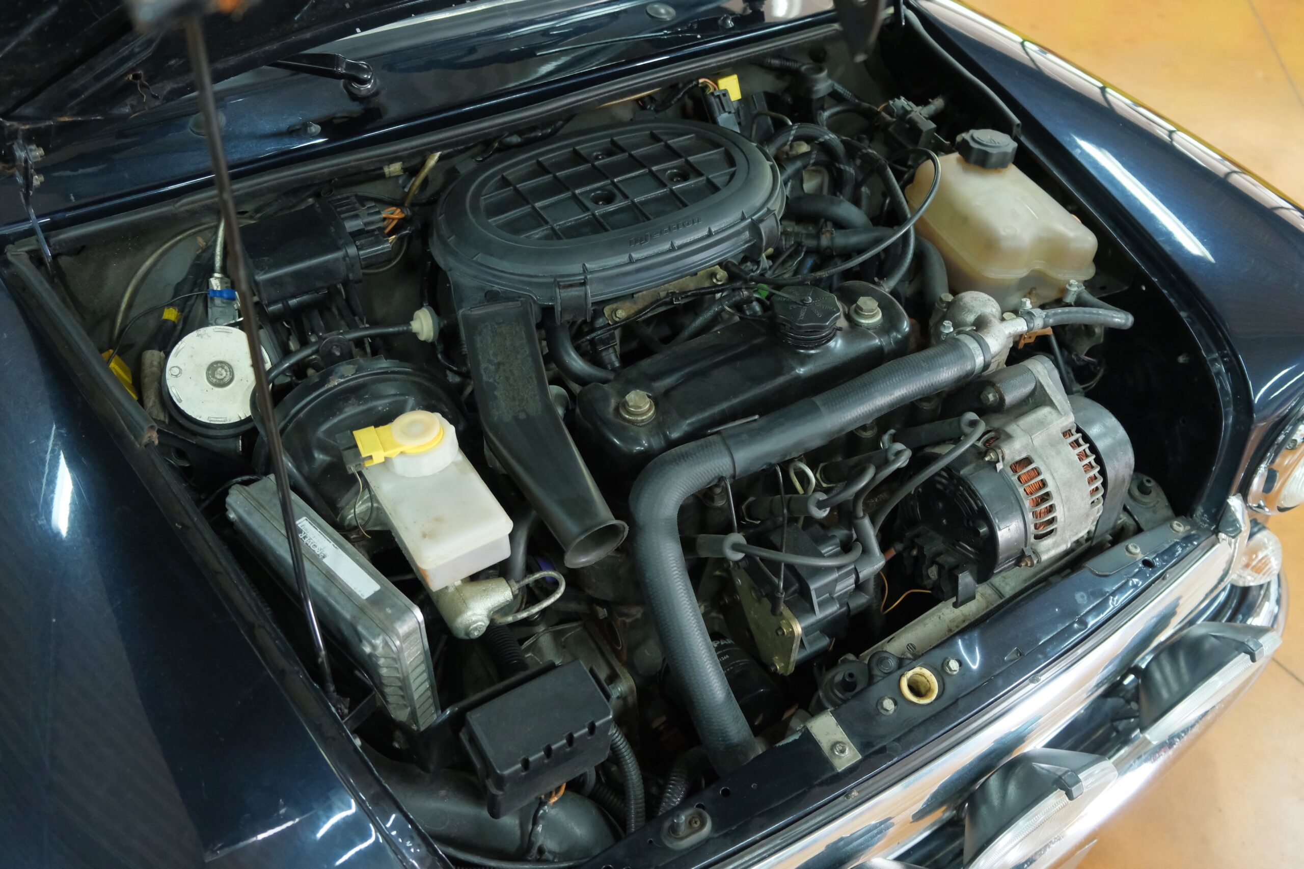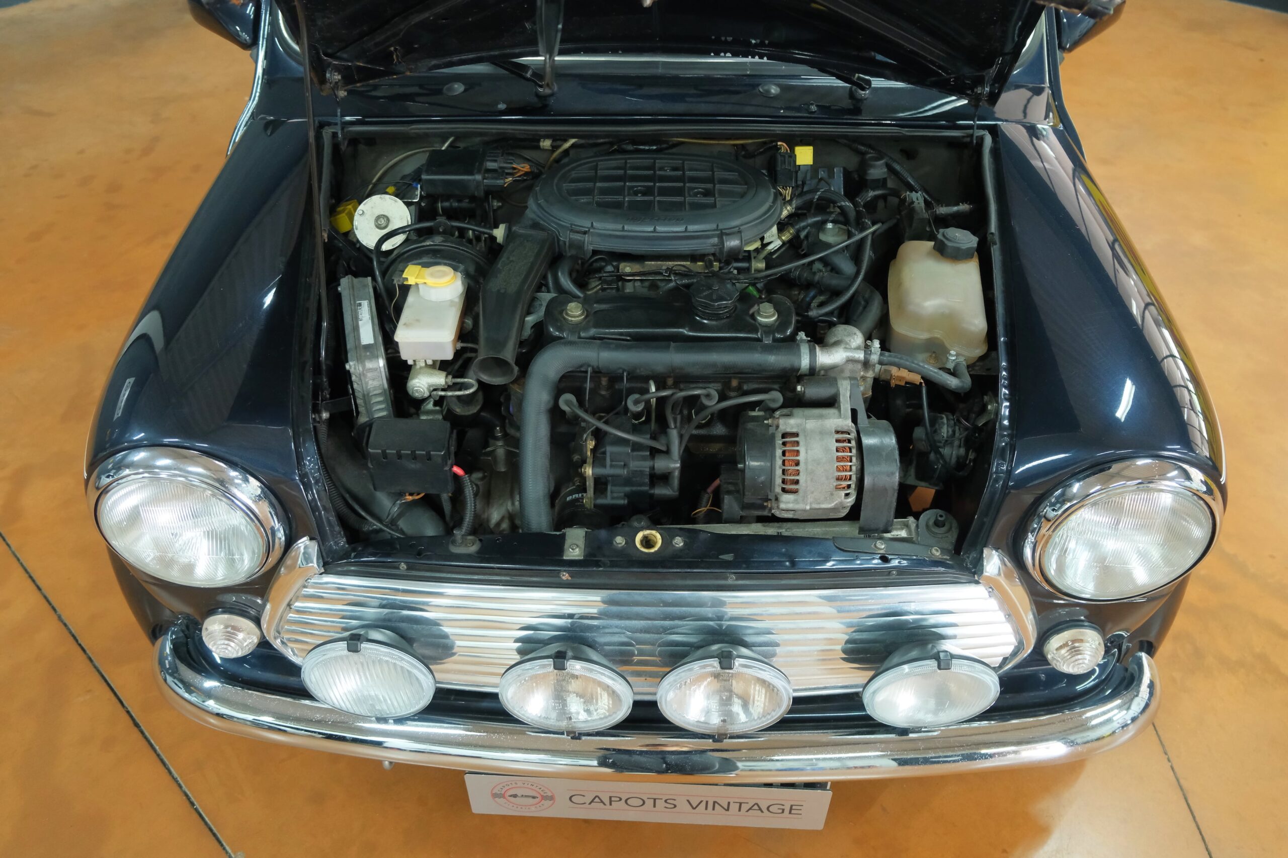 Le moteur 1275cc à injection est en très bonne santé. Le bruit avec le silencieux à doubles sorties centrales est très agréable. La boîte à 4 vitesses fonctionne remarquablement bien. Les freins également très bon. Les soubassements sont très sains et montrent une voiture parfaitement entretenue.