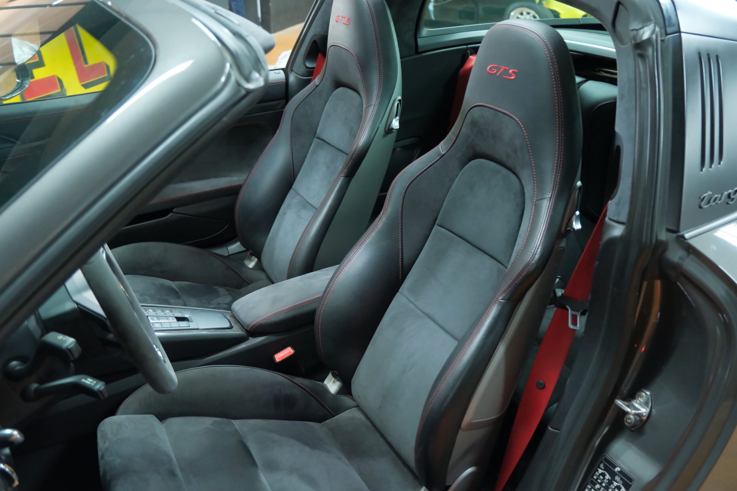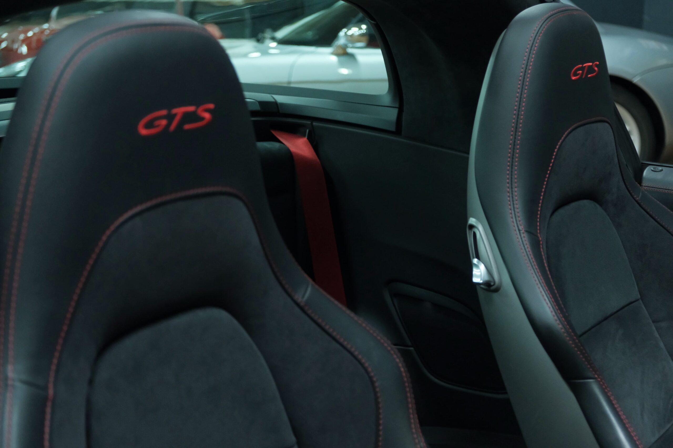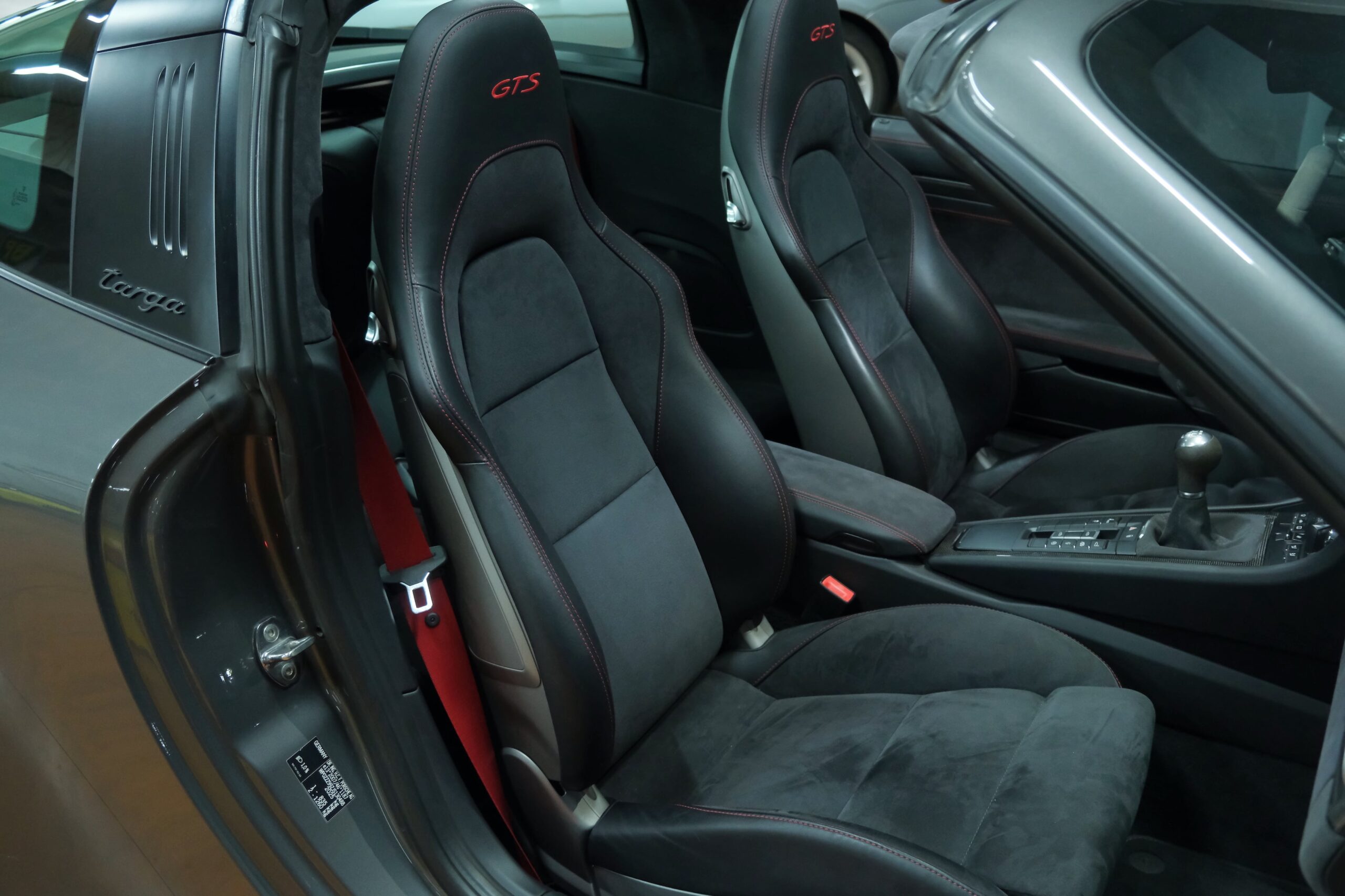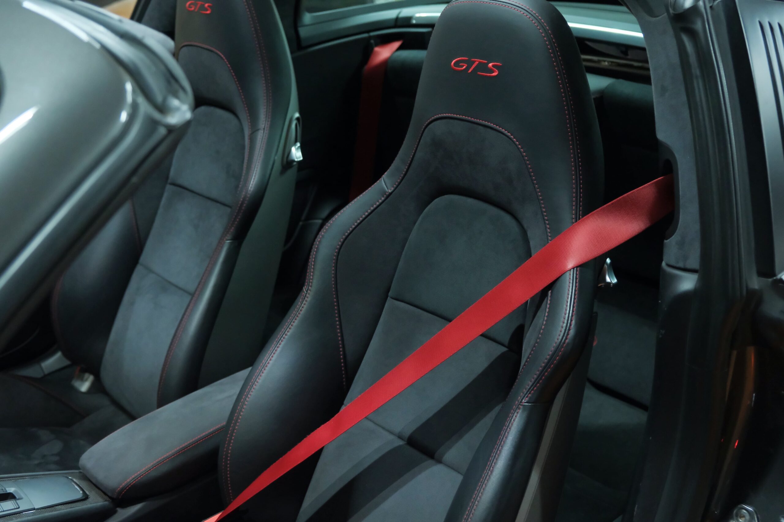 L’intérieur noir en cuir et alcantara est également en excellent état général. Les surpiqûres rouges de l’habitacle rappellent  les éléments rouges présents en options : des ceintures de sécurité au logo GTS brodé sur les sièges, en passant par le fond du compteur et les étriers de frein. Un contraste raffiné qui rehausse le coloris de la carrosserie et qui sublime encore davantage le caractère élégant et sportif de cette voiture.