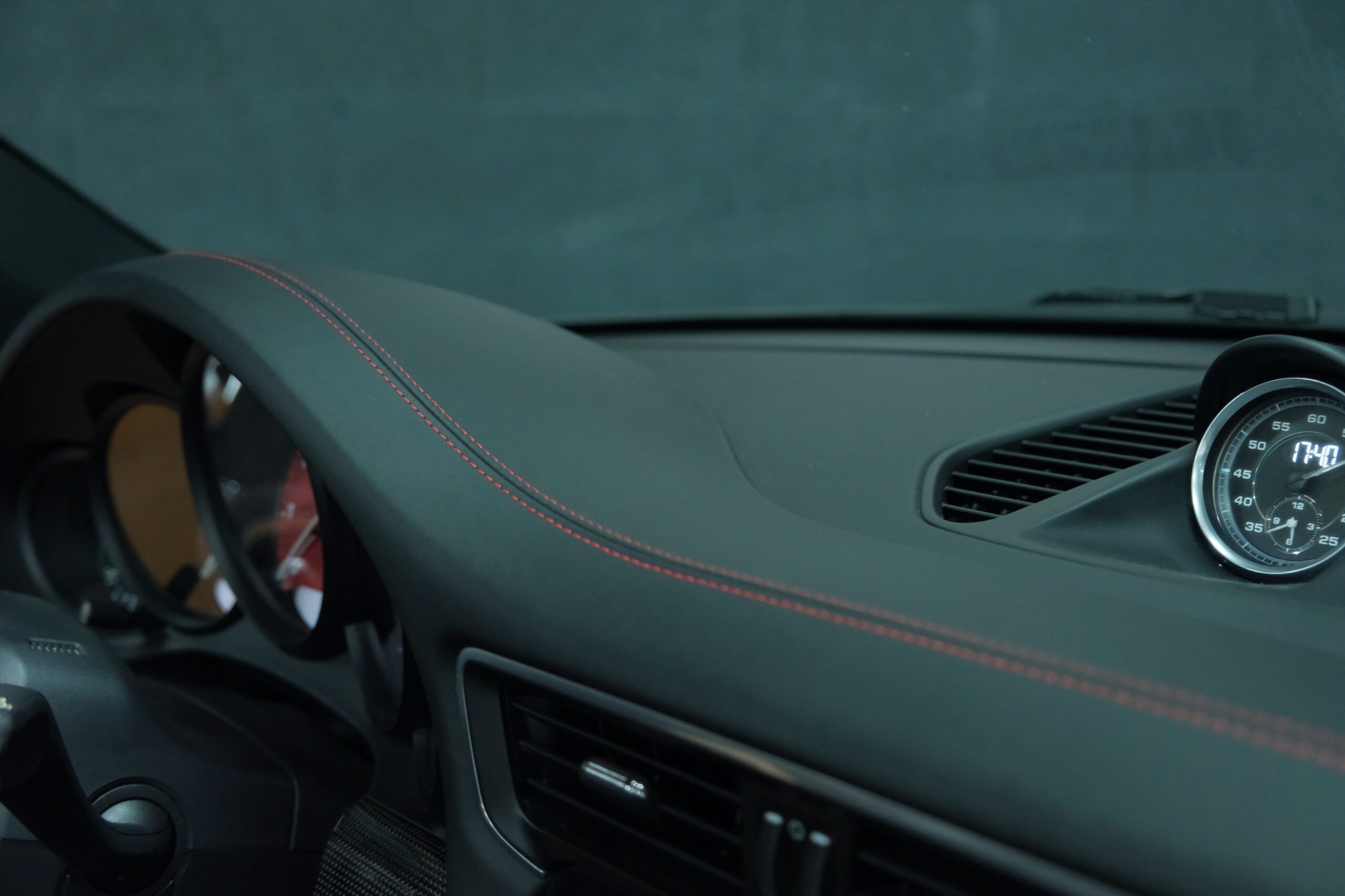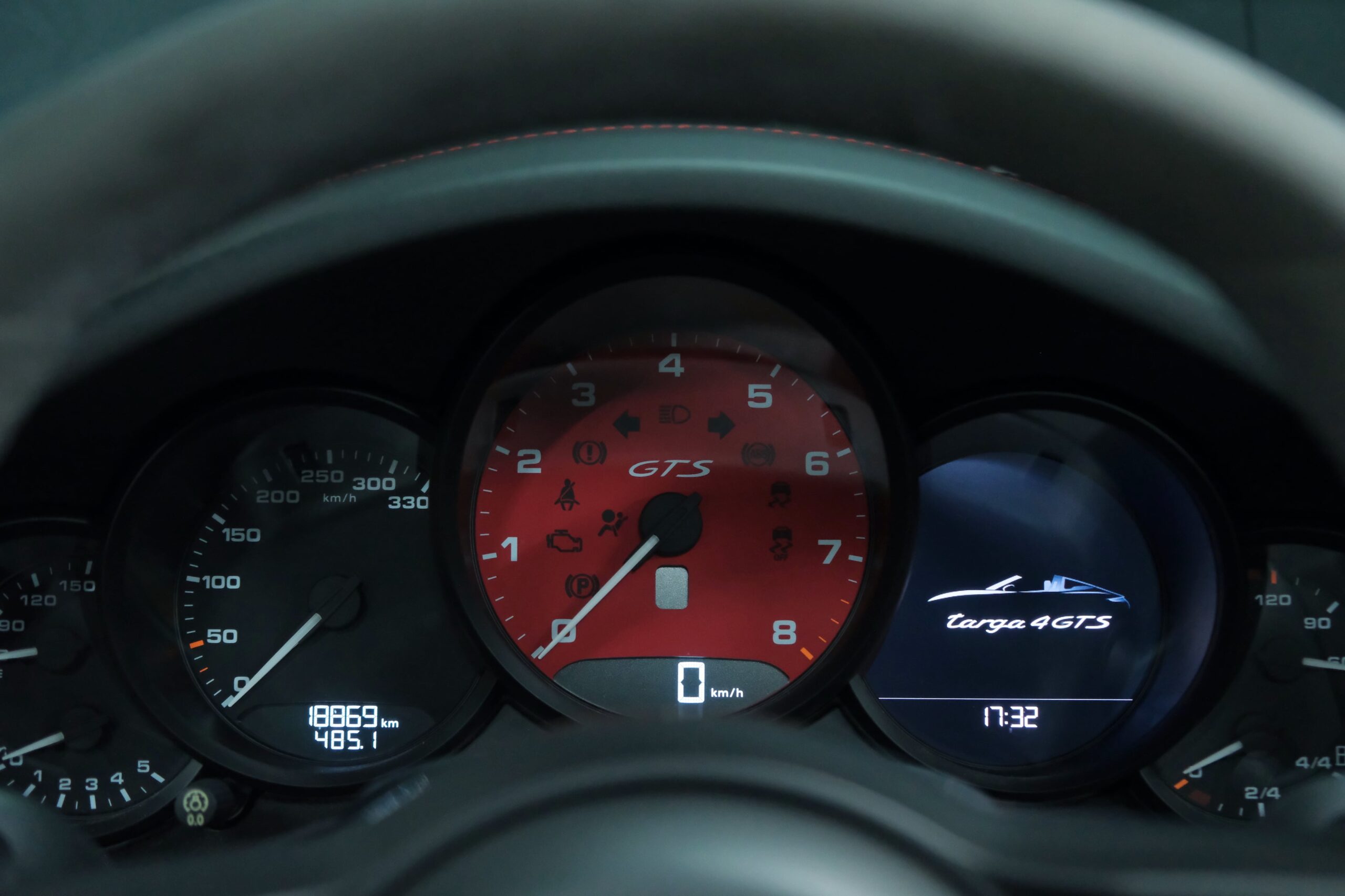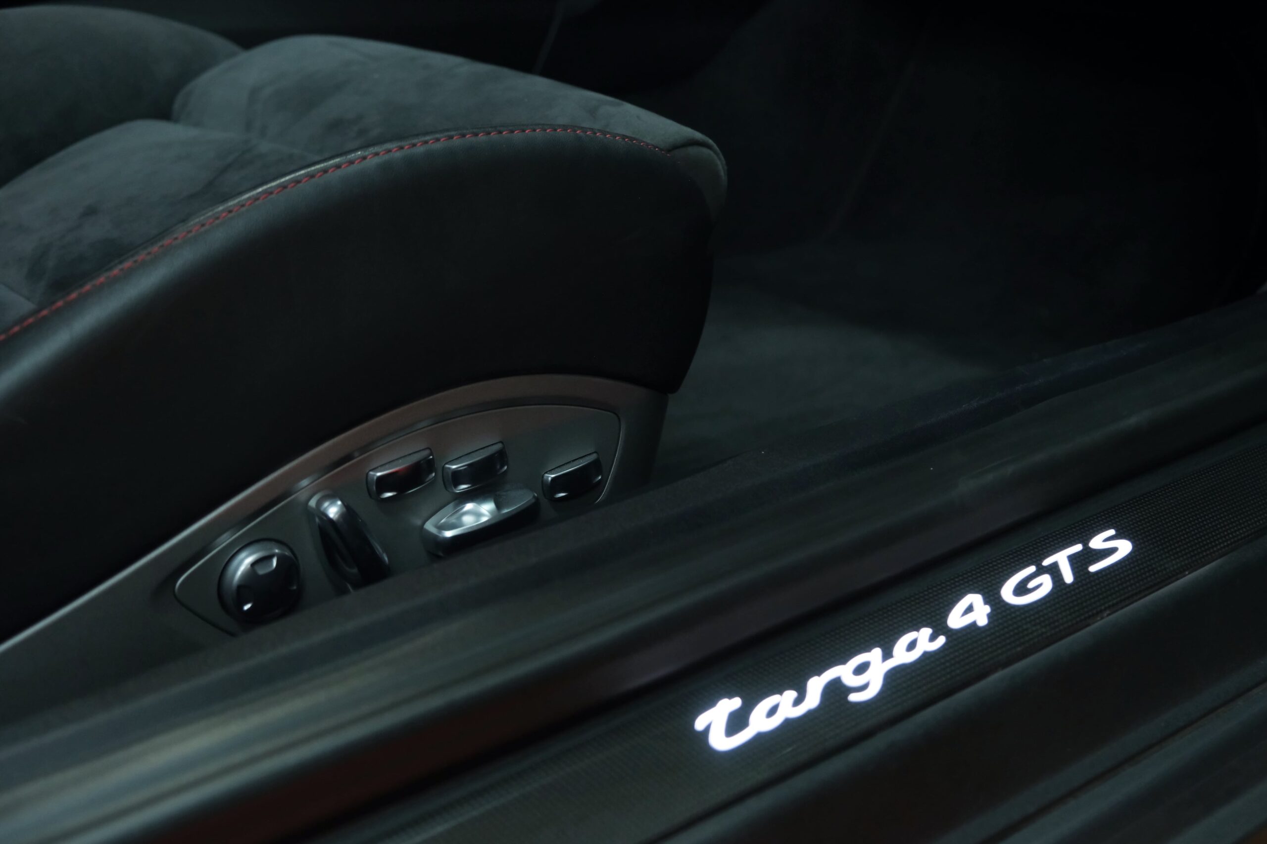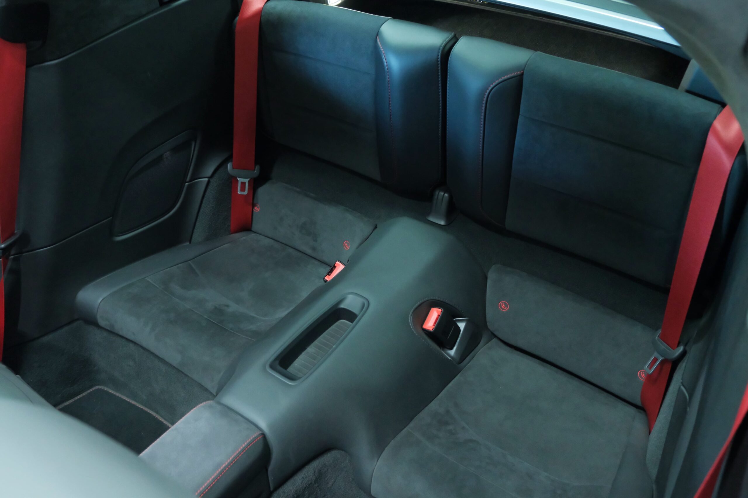 L’intérieur noir en cuir et alcantara est également en excellent état général. Les surpiqûres rouges de l’habitacle rappellent  les éléments rouges présents en options : des ceintures de sécurité au logo GTS brodé sur les sièges, en passant par le fond du compteur et les étriers de frein. Un contraste raffiné qui rehausse le coloris de la carrosserie et qui sublime encore davantage le caractère élégant et sportif de cette voiture.