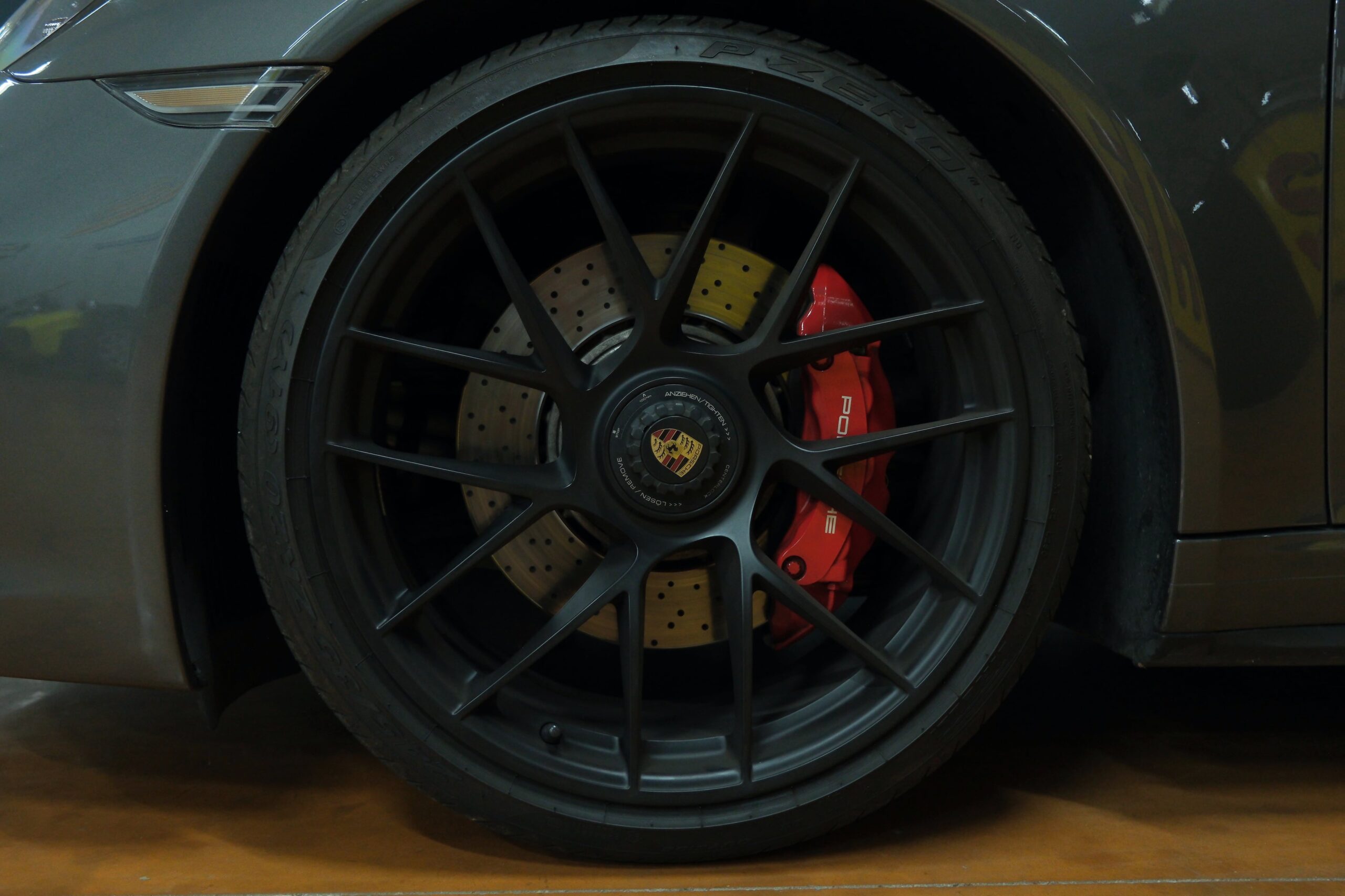 La carrosserie Grise Anthracite est en superbe état de présentation. L’ensemble des pare-chocs, bas-de-caisse, sont également en très bon état. Un PPF a été posé sur l’intégralité de la face avant du véhicule. Les pneus Pirelli P Zéro sont montés sur des jantes 20″ Turbo Sport noires.