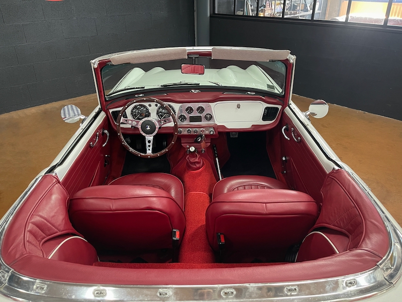 Nous vous proposons un très beau modèle de Triumph : une TR4 de 1962 restaurée il y a 5 ans. Elle se trouve aujourd’hui en très bel état général. Première mise en circulation en 1962, cette TR4 a été importé des USA en 2018, avant de recevoir une restauration complète entre 2018 et 2019. Nous disposons de factures et de photos attestant la qualité des travaux réalisés. Lors de cette restauration, le bloc moteur a été remis en état, avec une réfection de la culasse, des guides soupapes ainsi que des soupapes pour un passage au sans-plomb. À l’extérieur, l’auto est présentée dans sa belle couleur Blanche. On retrouve la présence de pare-chocs et butoirs chromés, et la voiture est équipée de jantes tôle blanches en 15 pouces avec enjoliveurs chromés ainsi que d’une ligne d’échappement en Inox. À l’intérieur, on retrouve une sellerie en simili Bordeaux, également restaurée en 2018. Le beau volant en bois vernis tulipé Astrali style Motolita ainsi que le pommeau en bois se marie parfaitement avec le tableau de bord blanc. L’auto est équipée d’une capote en simili noire. Un dossier de factures, un rapport d’expertise, le manuel utilisateur et des photos de la restauration accompagnent le véhicule. Livrée également avec le double des clés. Dossier photos et vidéo sur demande.