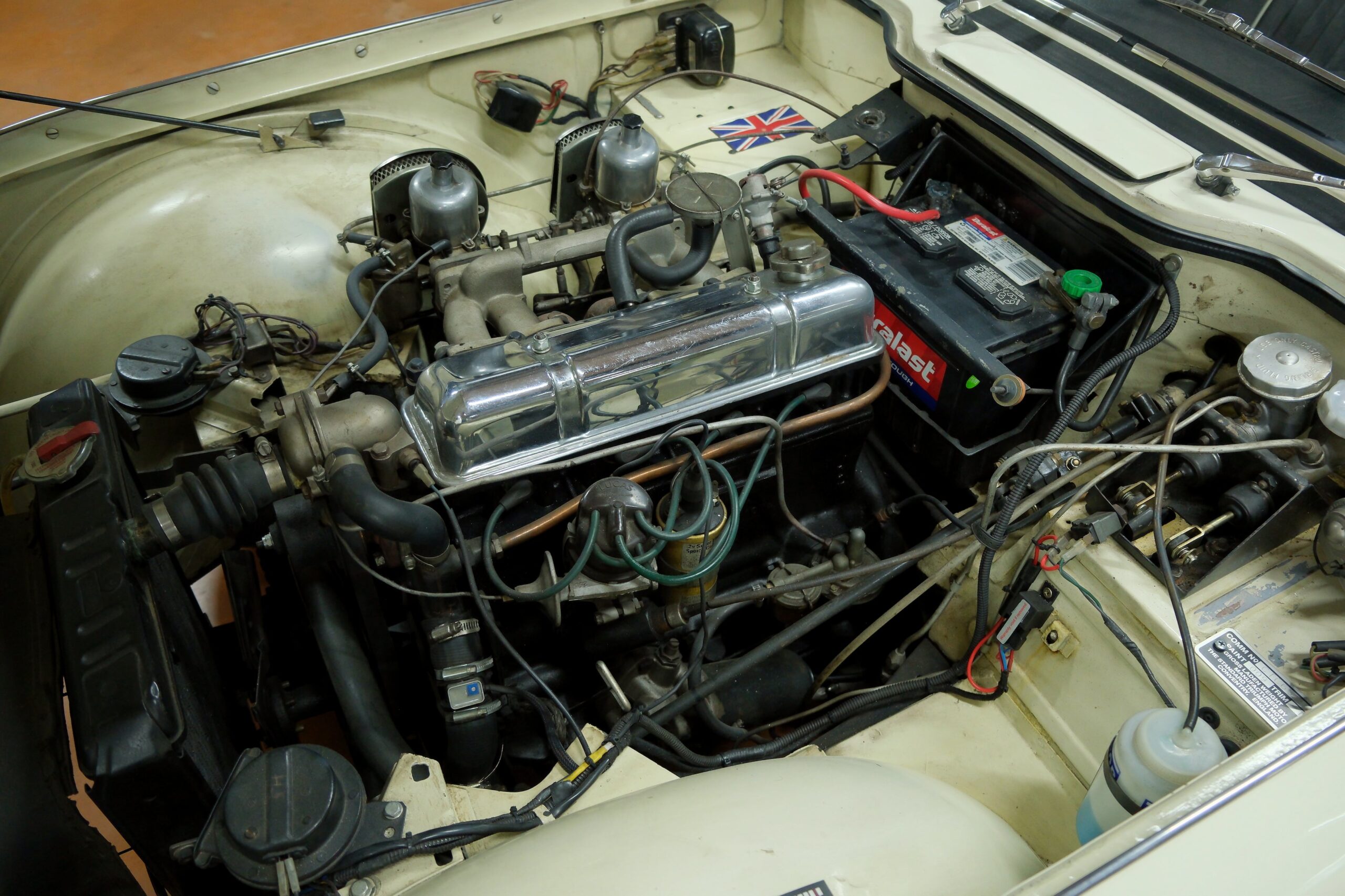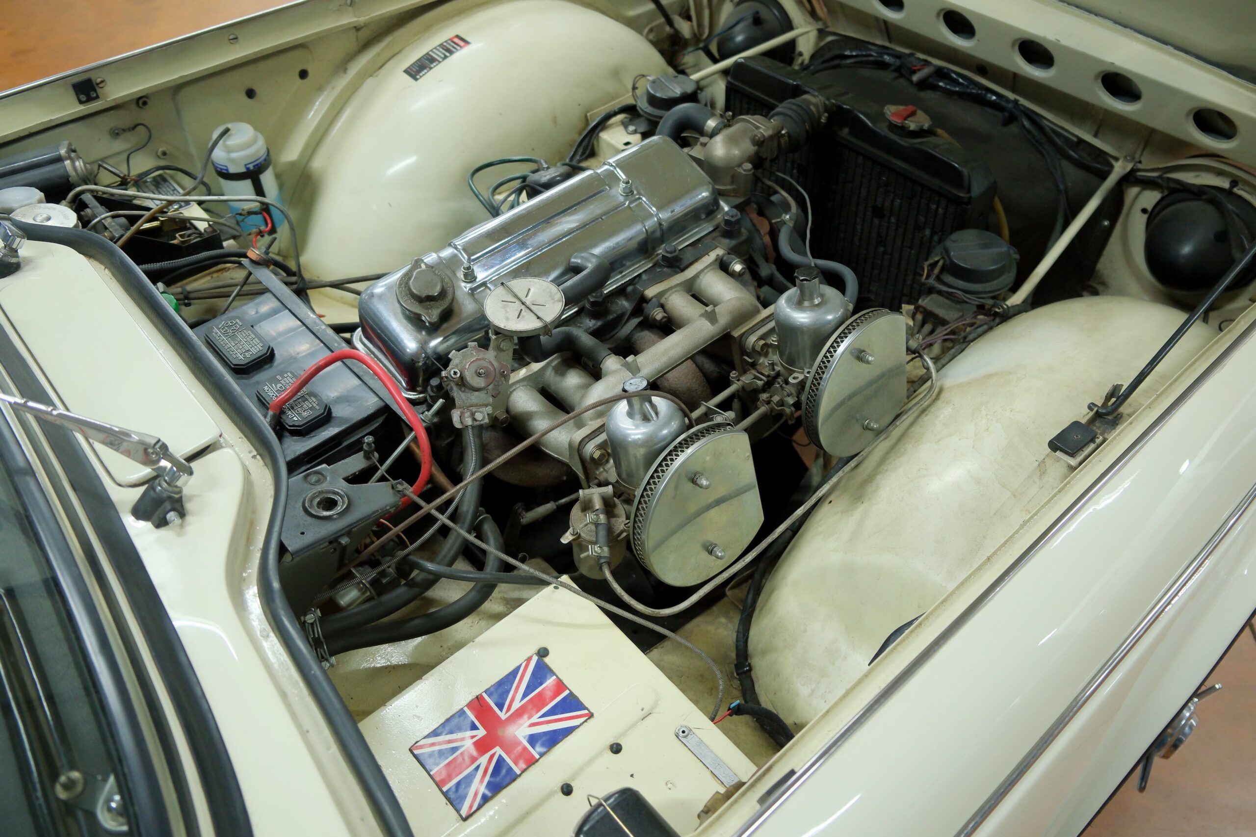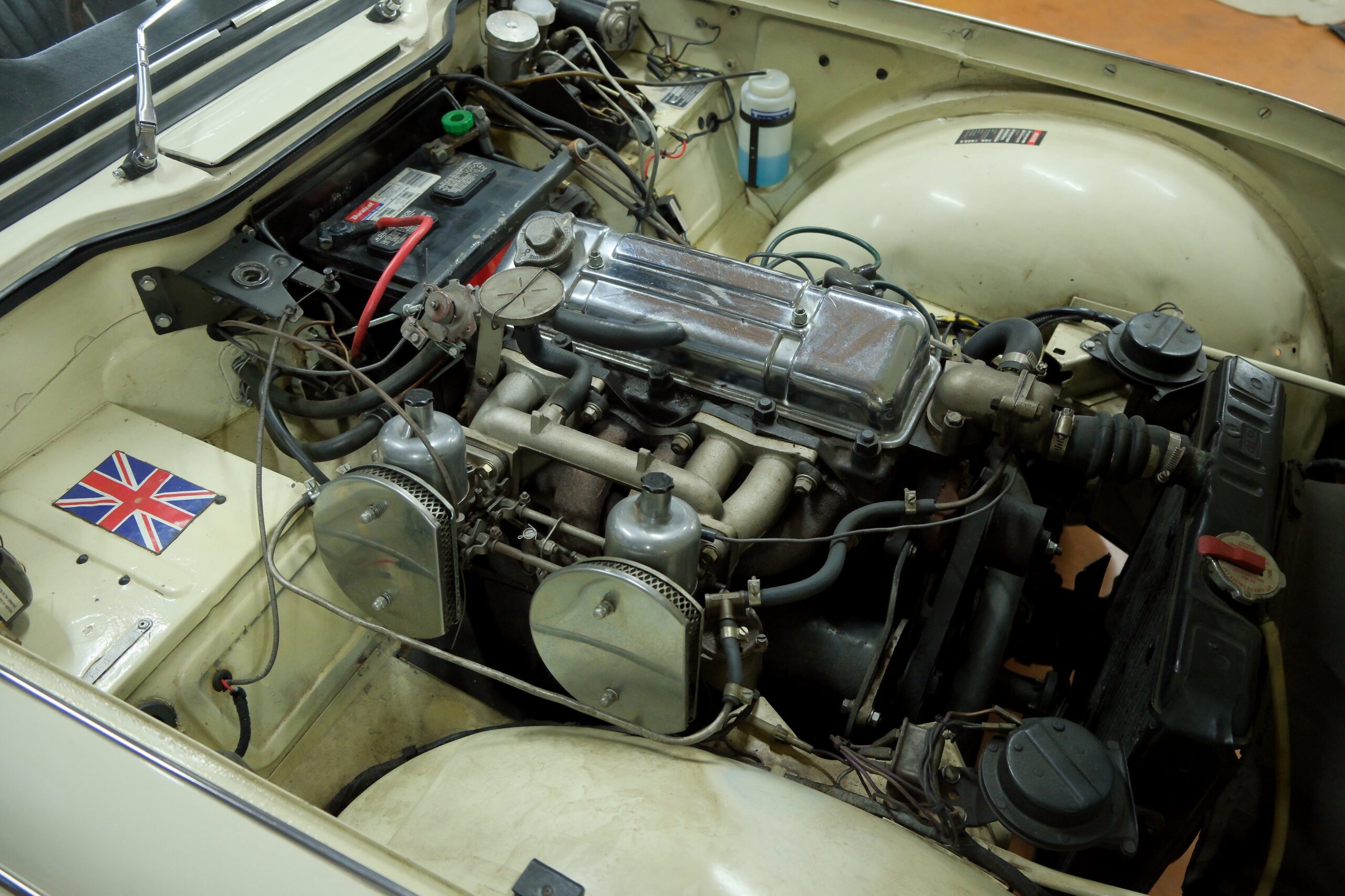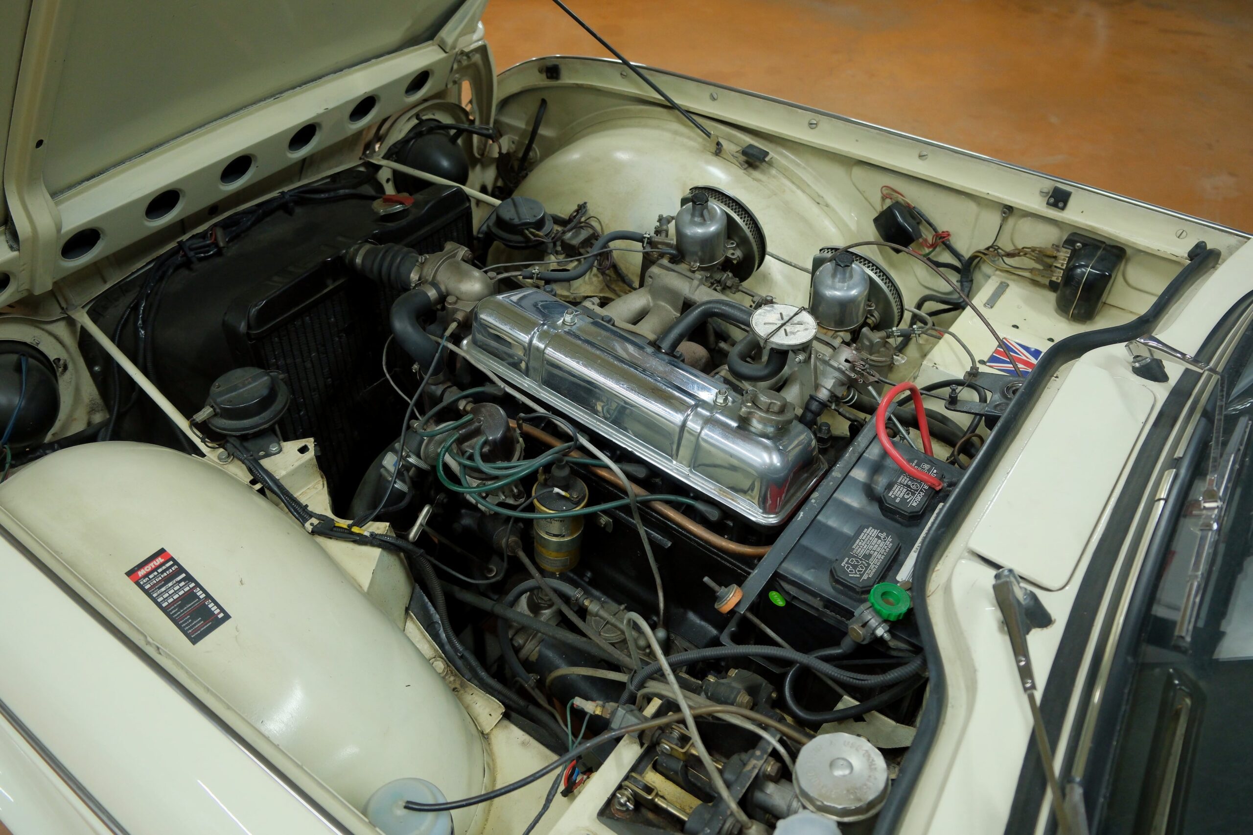 Cette élégante anglaise se distingue par une combinaison de couleurs raffinée : carrosserie crème avec une belle sellerie noire soulignée de passepoils blancs. Elle est équipée du moteur 4 cylindres de 2 138 cm³, alimenté par deux carburateurs SU, associé à une boîte de vitesses à 4 rapports entièrement synchronisés. La mécanique est en très bon état de fonctionnement.