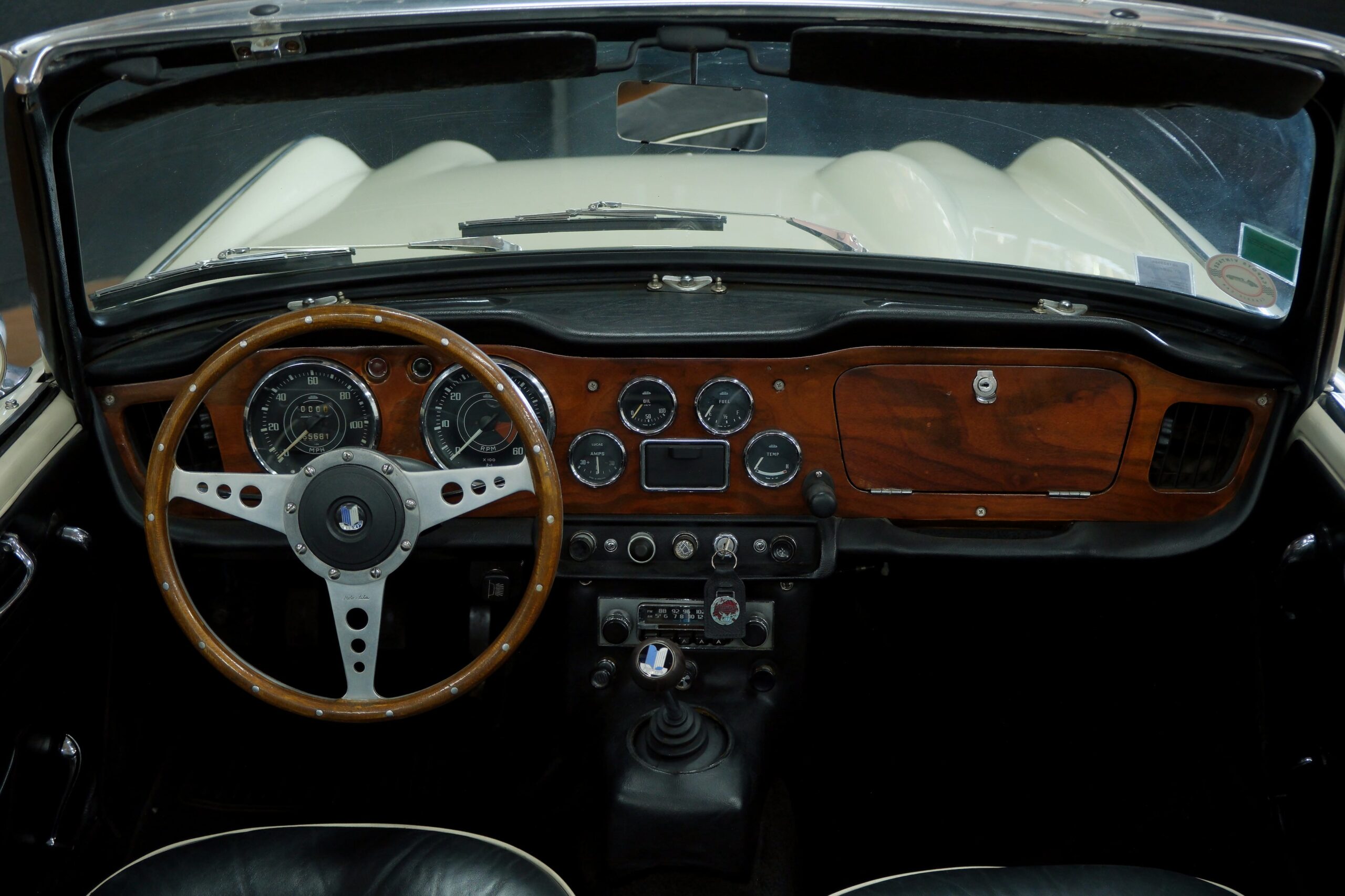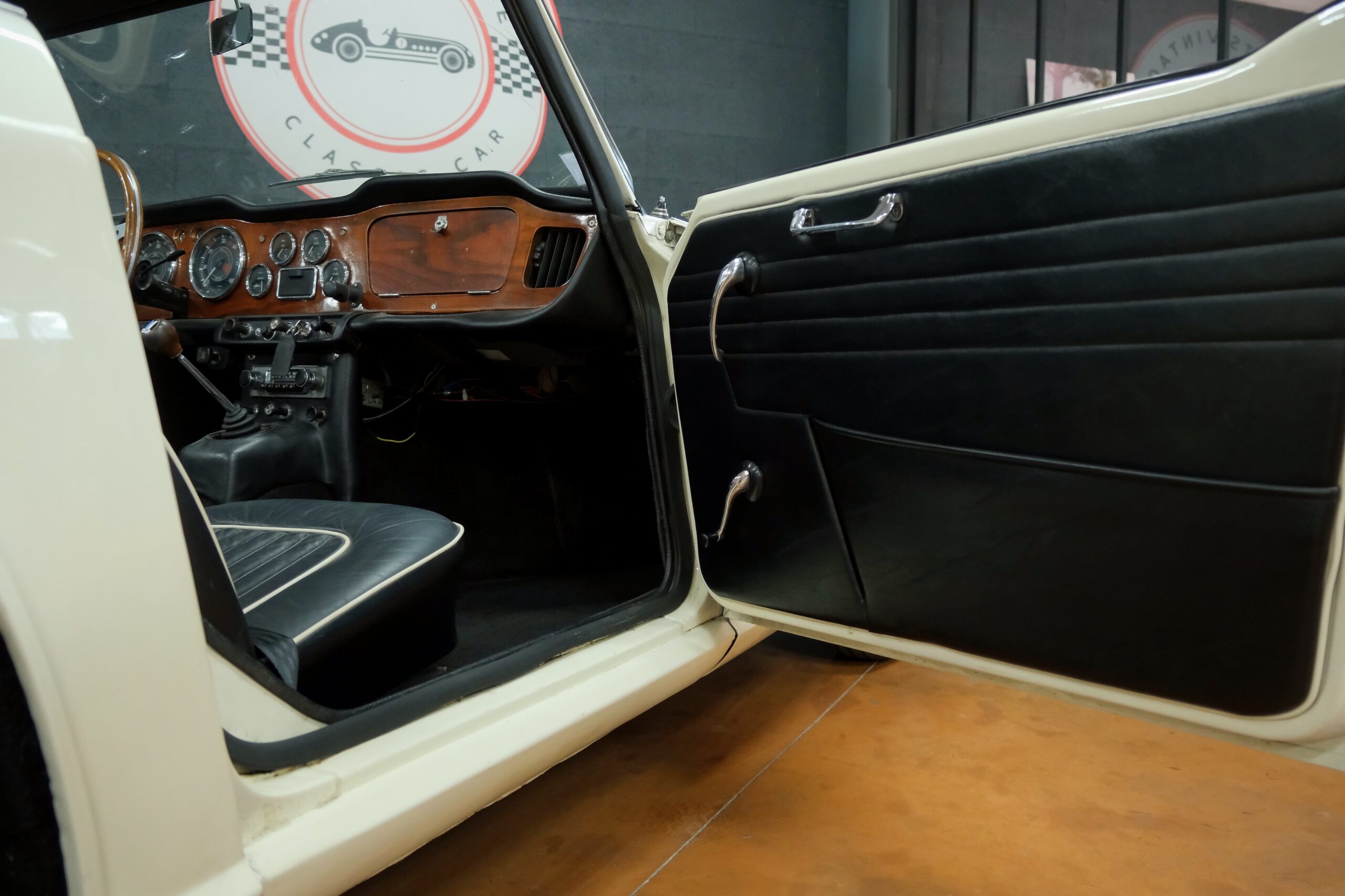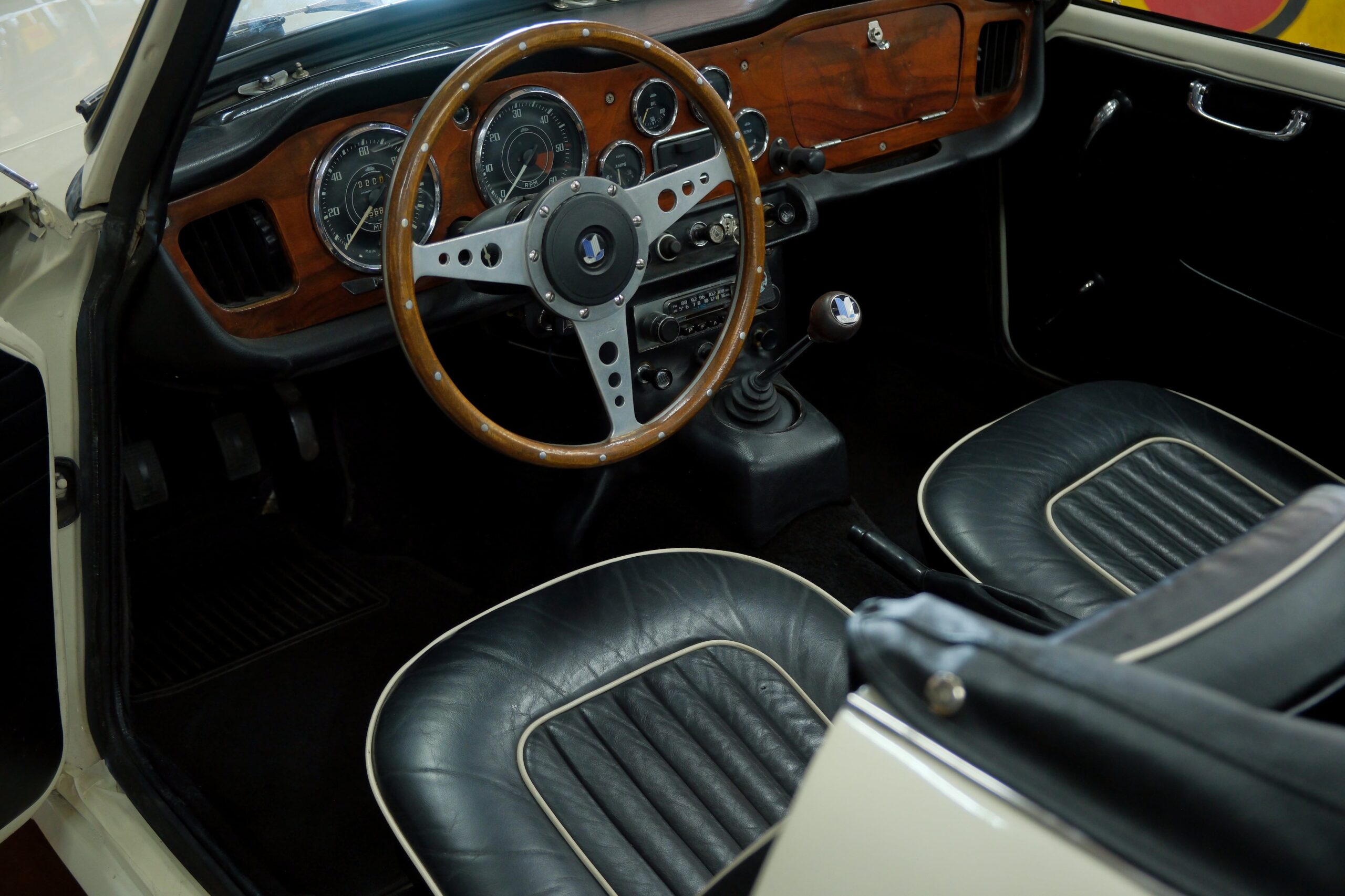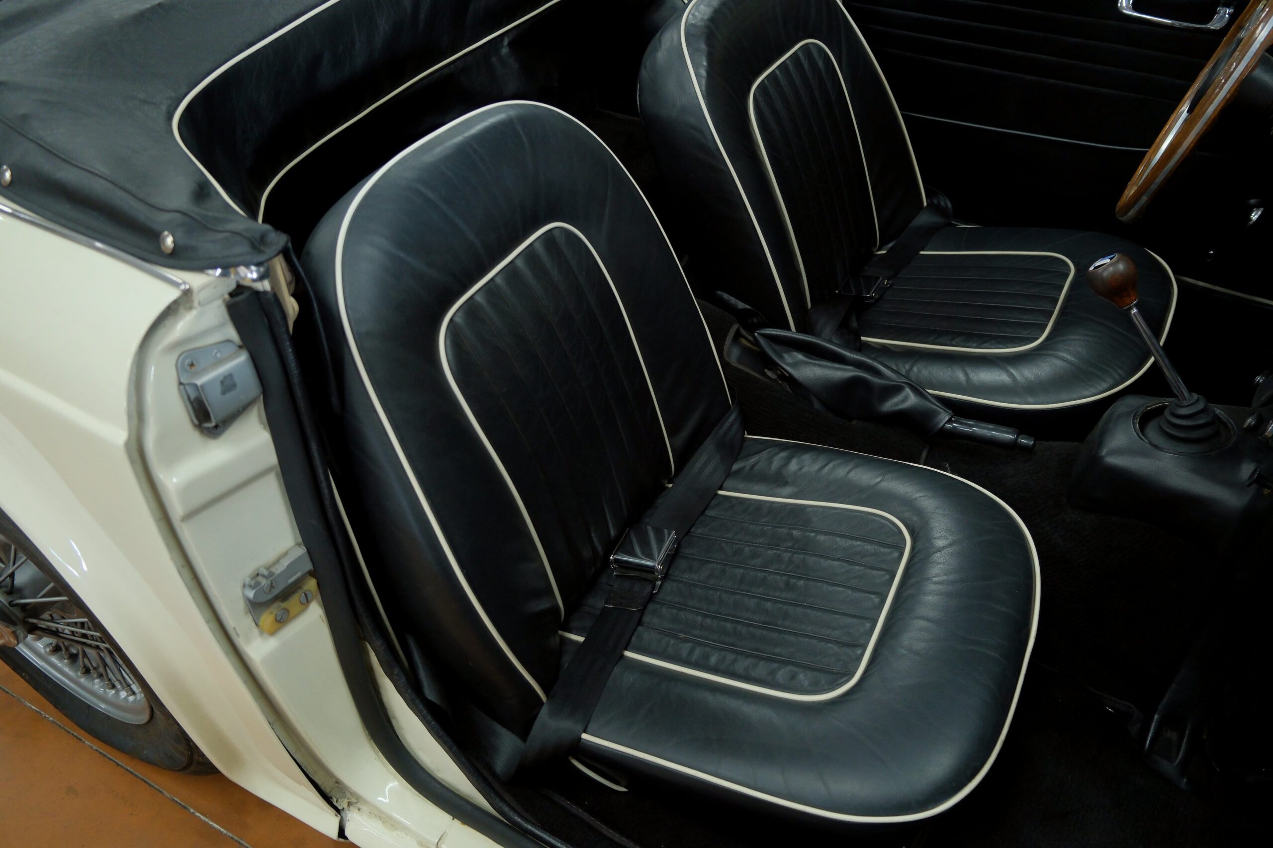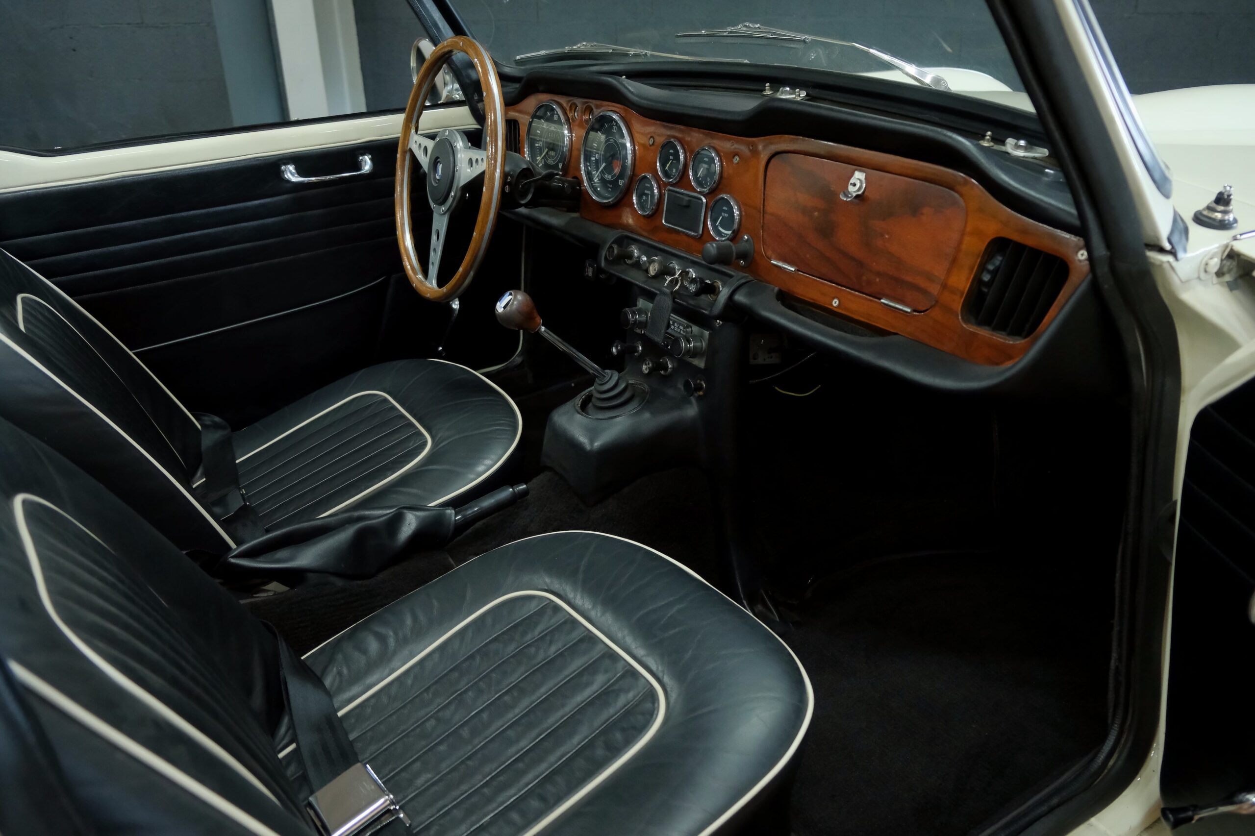 L’intérieur a été refait: La sellerie noire avec passepoil blanc respecte l’origine. Toute l’instrumentation est fonctionnelle. Un volant bois Motolita a été monté ainsi qu’un pommeau de levier de vitesses. Les contre-portes, le tableau de bord en bois et les moquettes sont en excellent état de présentation.
