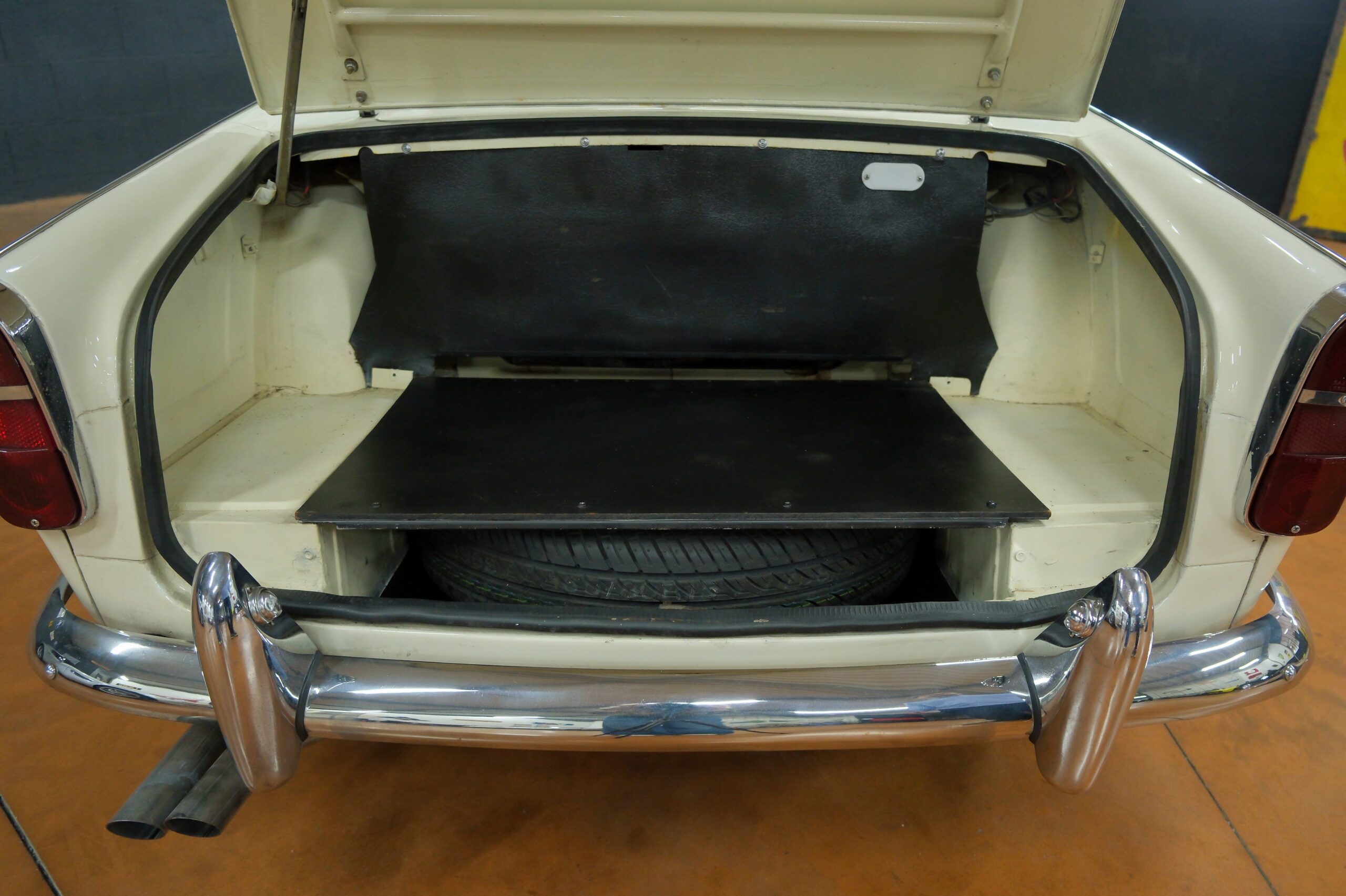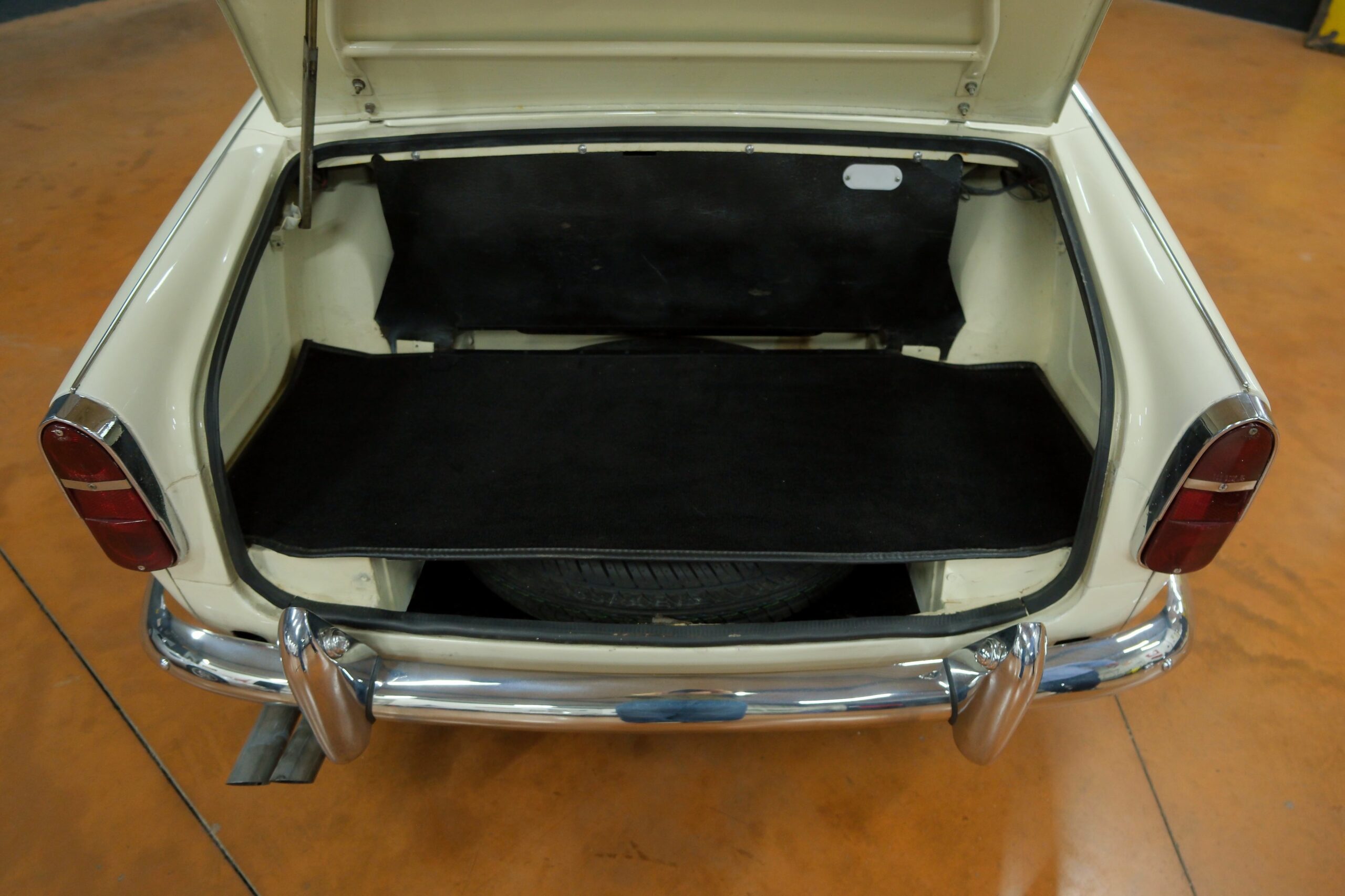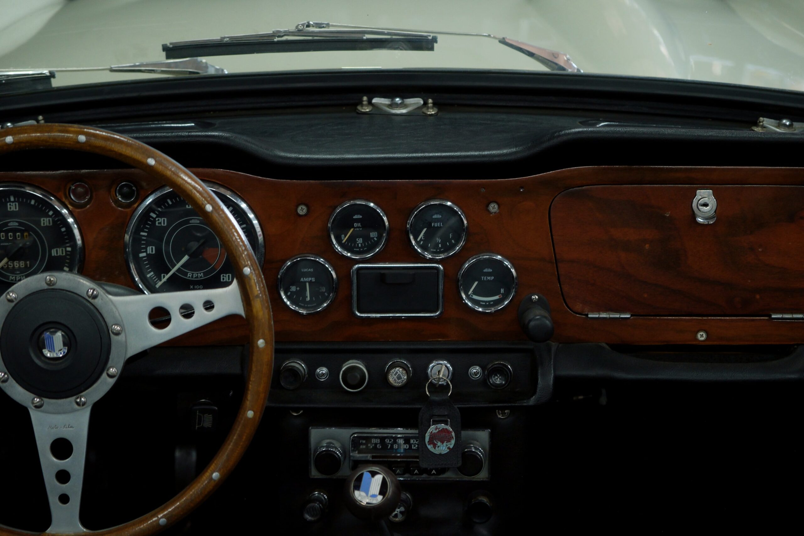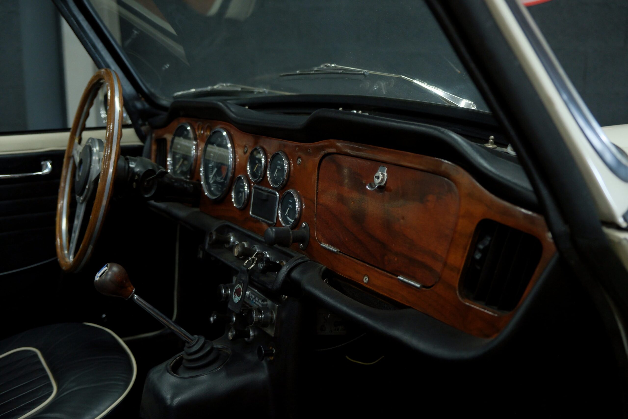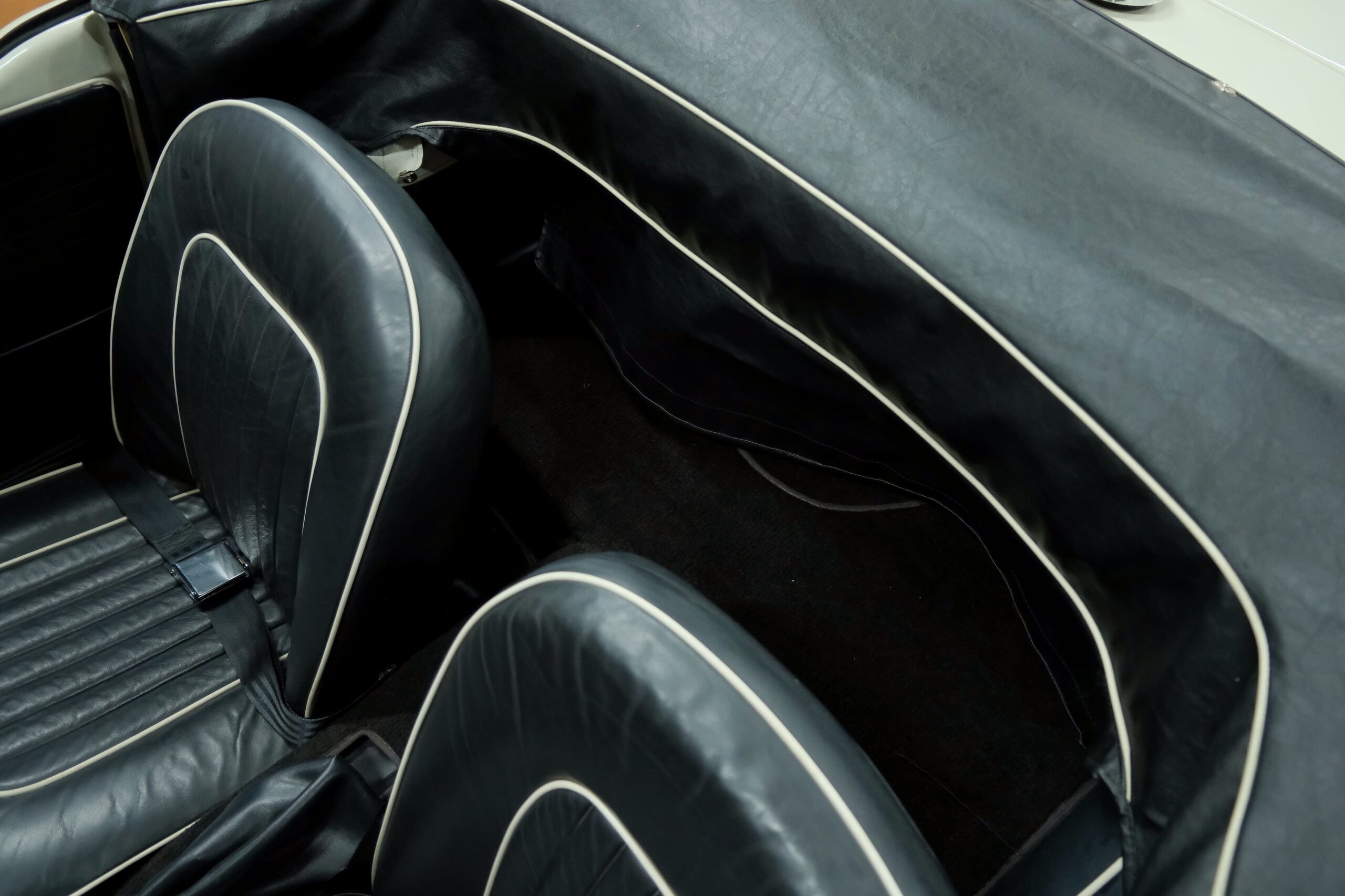 L’intérieur a été refait: La sellerie noire avec passepoil blanc respecte l’origine. Toute l’instrumentation est fonctionnelle. Un volant bois Motolita a été monté ainsi qu’un pommeau de levier de vitesses. Les contre-portes, le tableau de bord en bois et les moquettes sont en excellent état de présentation.