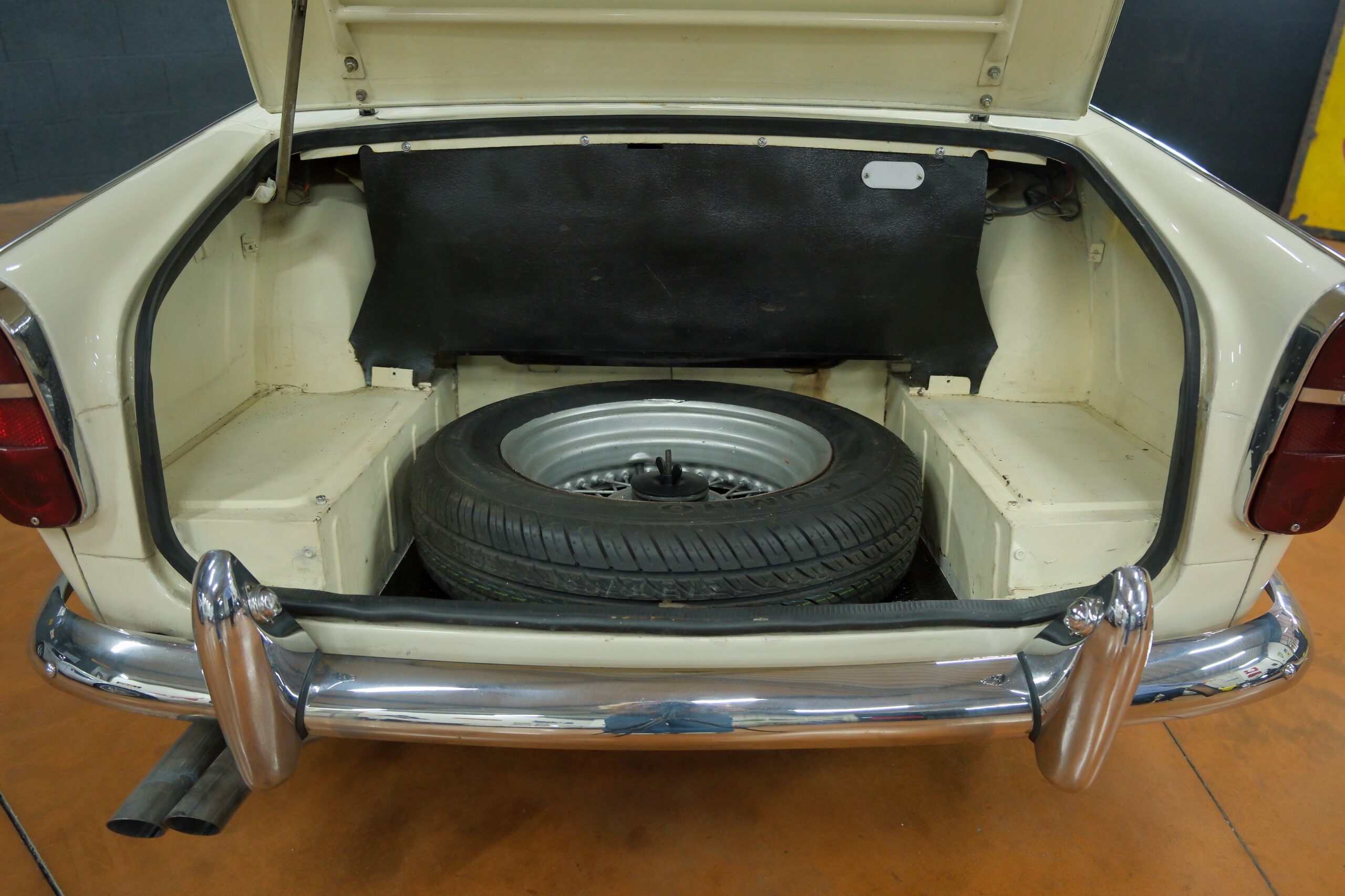 La restauration de la carrosserie est ancienne mais présente très bien malgrè son age et à l’utilisation de cette auto. Les chromes et les pare-chocs sont correctement alignés et en bon état. La voiture est équipée de longues-portées. Les alignements capot, coffre et portières sont bons. Les pneus en très bon état sont montés sur des roues à rayons peintes avec knock-off chromé.